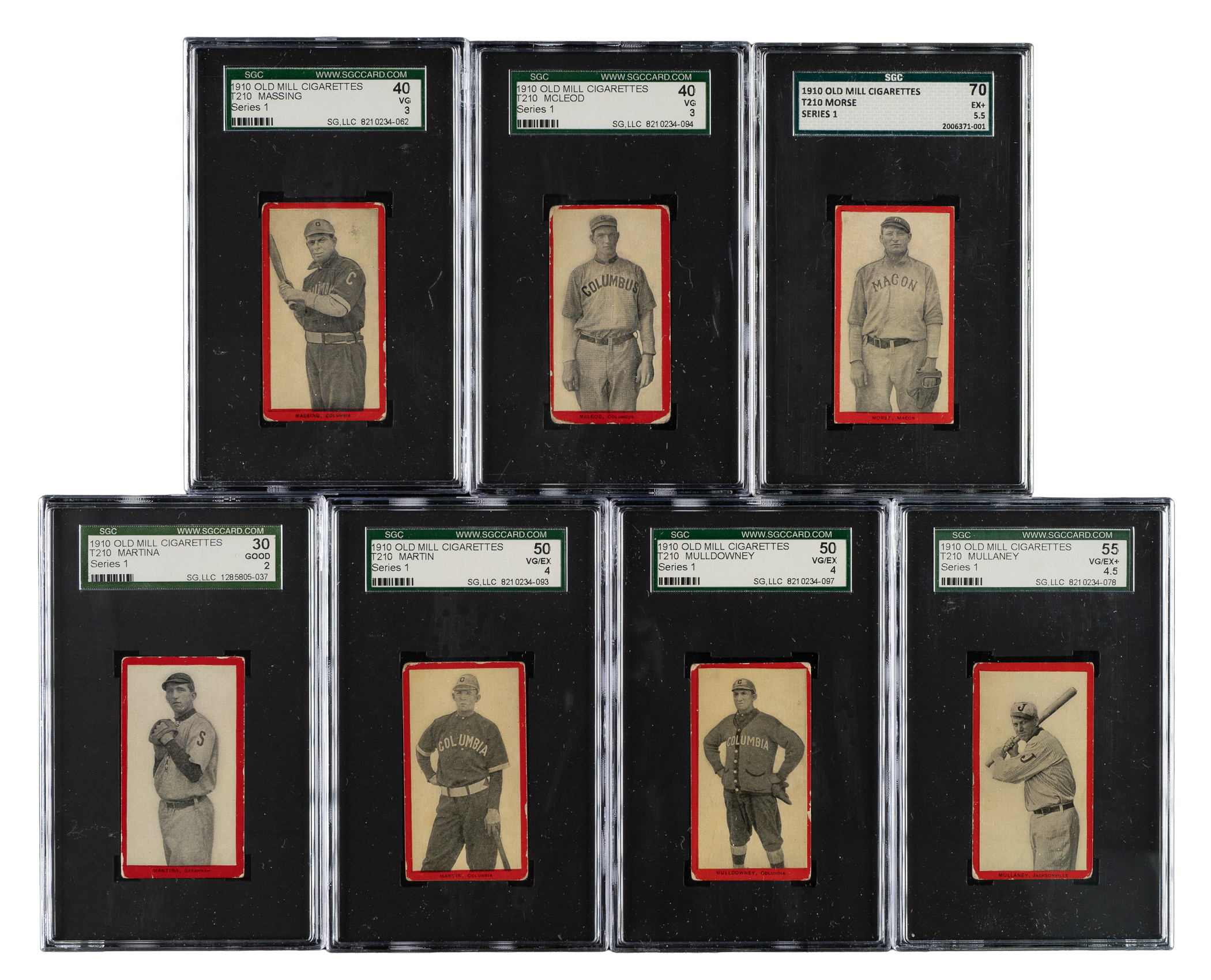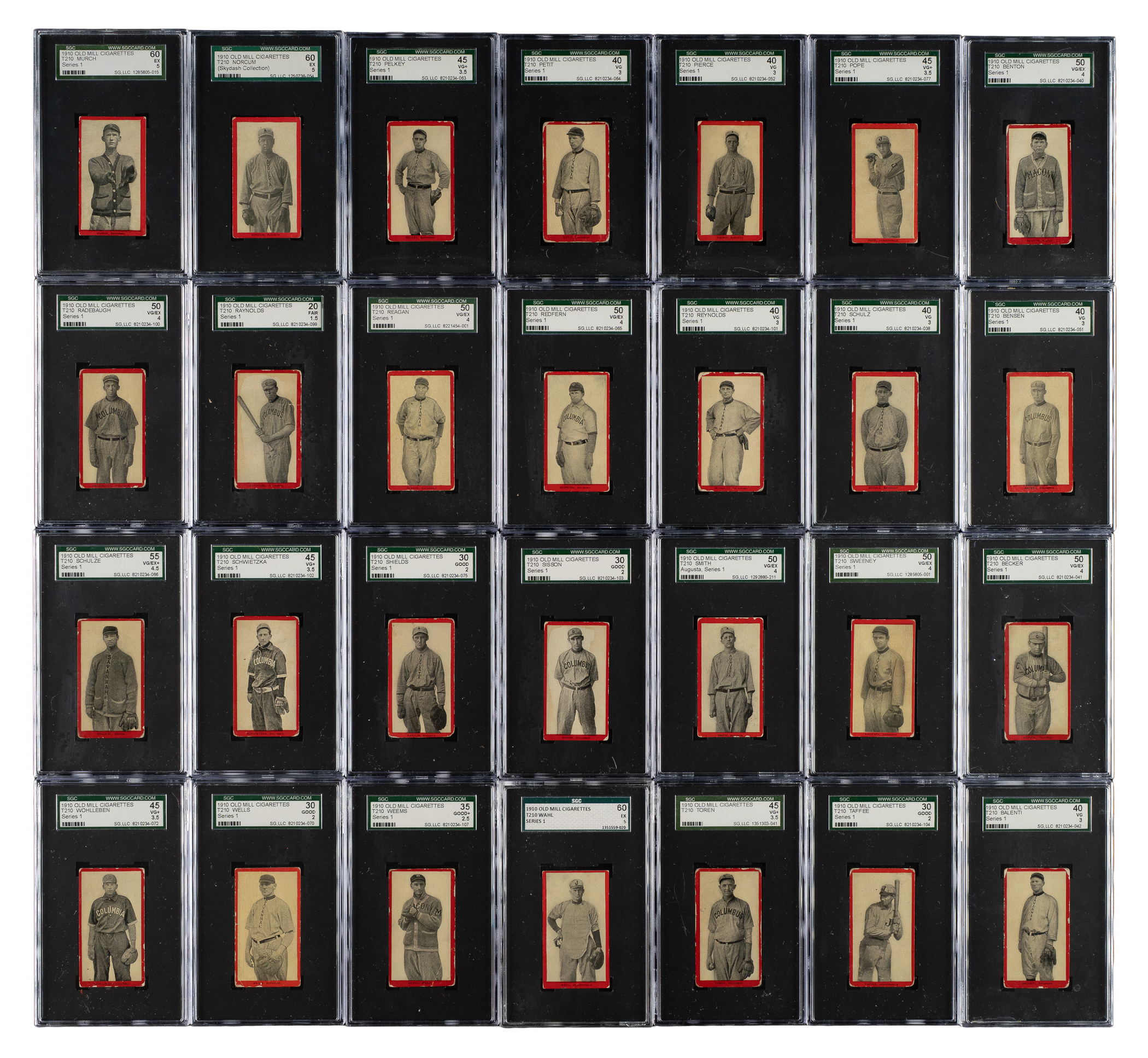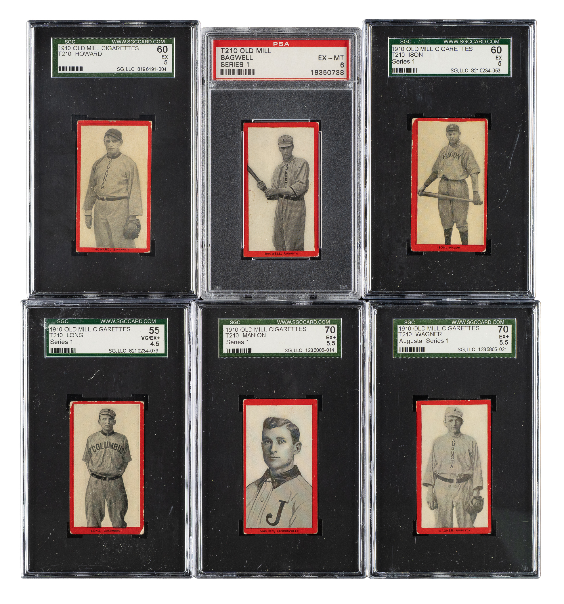 Presented is a near-complete set of 74 (out of 75) different 1910 T210 Old Mill "Series 1" cards featuring South Atlantic League players, each graded and encapsulated by SGC (one by PSA). Missing only Viola for completion (offered as a separate lot in this auction). The T210 set is actually composed of eight different series, each a set unto itself and each representing a different minor league. A near-complete series such as this is very rarely offered. SGC Grading Composite: EX-MT 6 (1 card): Bagwell (PSA). EX+ 70 (3 cards): Manion, Morse, and Wagner. EX 60 (5 cards): Howard, Ison, Murch, Norcum, and Wahl. VG/EX+ 55 (4 cards): De Fraites, Long, Mullaney, and Schulze. VG/EX 50 (14 cards): Becker, Benton, Cavender, Huber, Kalkhoff, Krebs, Lewis/Columbia, Martin, Mulldowney, Radebaugh, Reagan, Redfern, Smith, and Sweeney. VG+ 45 (7 cards): Dwyer, Hauser, Pelkey, Pope, Schwietzka, Toren, and Wohlleben. VG 40 (22 cards): Balenti, Benson, Dudley, Eubank, Fox, Hartley, Hille, Hoyt, Jones, Lawrence, Lee/Jacksonville, Lee/Macon, Lewis/Columbus, Lipe/batting, Lipe/portrait, Marshall, Massing, McLeod, Petit, Pierce, Reynolds, and Schulz. GOOD+ 35 (2 cards): Hannifan and Weems. GOOD 30 (13 cards): Bierkortte, Bierman, Breitenstein, Bremmerhof, Collins, Edwards, Enbanks, Martina, McMahon, Shields, Sisson, Taffee, and Wells. FAIR 20 (2 cards): Carter and Raynolds. POOR 10 (1 card): Magoon. The T210 Old Mill Tobacco card set has always been extremely highly regarded by advanced collectors because it features so many players who appear in no other sets, it has a very distinctive design, it is scarce compared to most other tobacco-card sets of the era, and it features striking photos that are unique to the set. The T210 Old Mill set is also well known by all collectors due to its inclusion of Joe Jackson (Series 8) and Casey Stengel (Series 6), which are today regarded as two of the most famous and valuable of all baseball cards. It is virtually impossible to complete the entire set, and only a few complete sets (or even sets minus a few cards) have ever been assembled. This is a rare opportunity to acquire a near-complete set of one of the key series, featuring South Atlantic League players (some of these players will be familiar for their appearance in the T206 set). Total: 74 cards. The size/weight of this item requires that there will be an additional shipping charge for this lot.