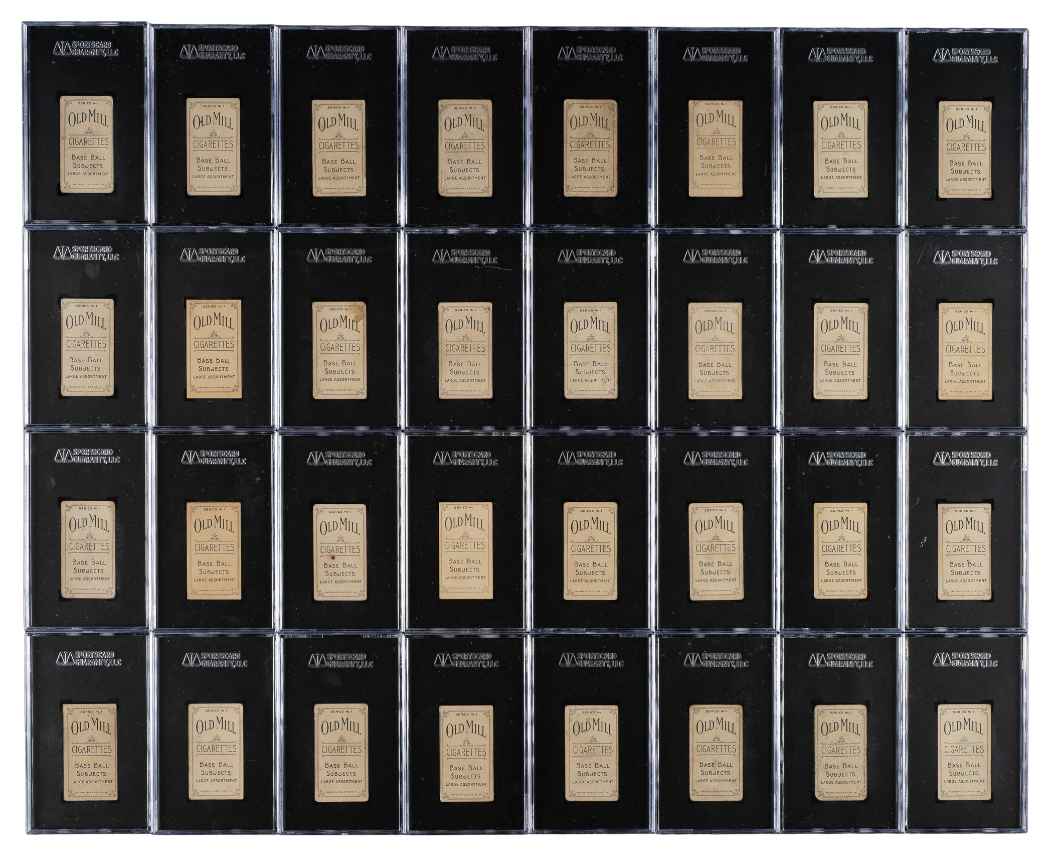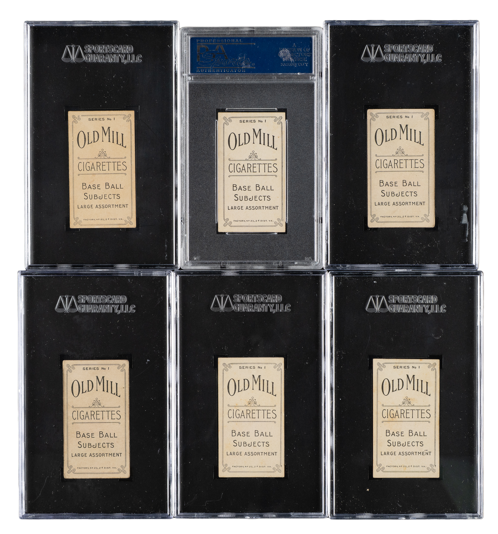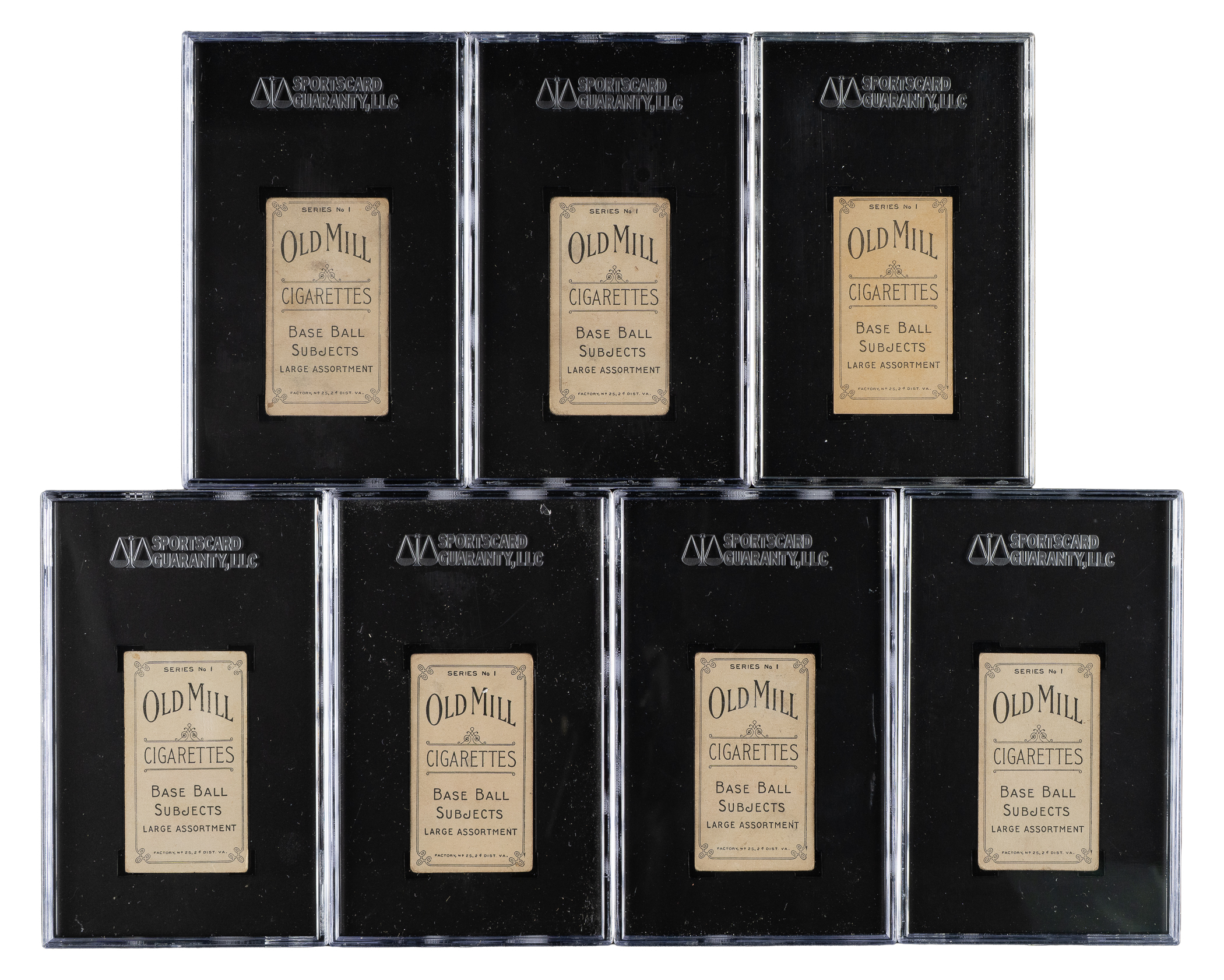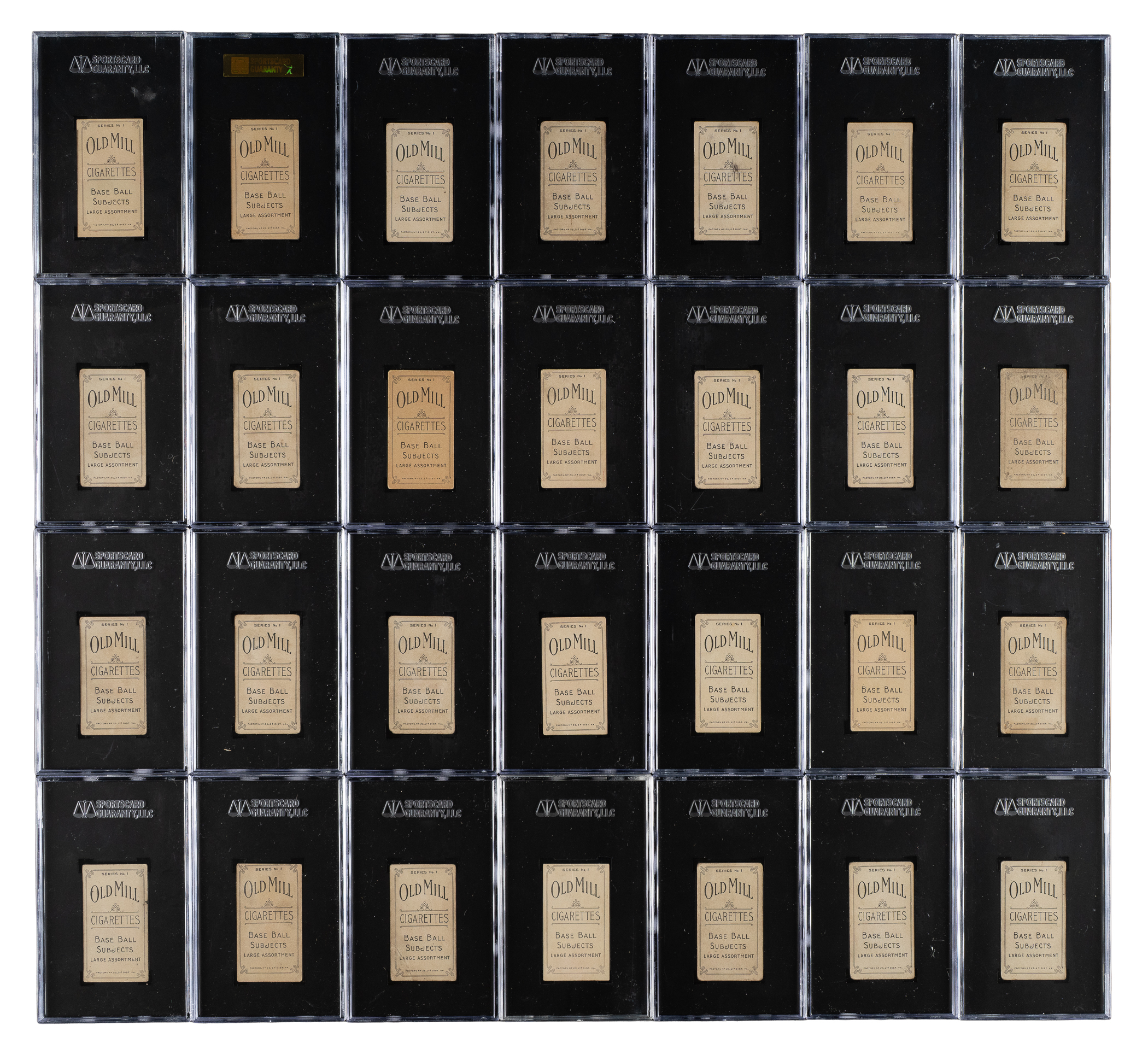 Presented is a near-complete set of 74 (out of 75) different 1910 T210 Old Mill "Series 1" cards featuring South Atlantic League players, each graded and encapsulated by SGC (one by PSA). Missing only Viola for completion (offered as a separate lot in this auction). The T210 set is actually composed of eight different series, each a set unto itself and each representing a different minor league. A near-complete series such as this is very rarely offered. SGC Grading Composite: EX-MT 6 (1 card): Bagwell (PSA). EX+ 70 (3 cards): Manion, Morse, and Wagner. EX 60 (5 cards): Howard, Ison, Murch, Norcum, and Wahl. VG/EX+ 55 (4 cards): De Fraites, Long, Mullaney, and Schulze. VG/EX 50 (14 cards): Becker, Benton, Cavender, Huber, Kalkhoff, Krebs, Lewis/Columbia, Martin, Mulldowney, Radebaugh, Reagan, Redfern, Smith, and Sweeney. VG+ 45 (7 cards): Dwyer, Hauser, Pelkey, Pope, Schwietzka, Toren, and Wohlleben. VG 40 (22 cards): Balenti, Benson, Dudley, Eubank, Fox, Hartley, Hille, Hoyt, Jones, Lawrence, Lee/Jacksonville, Lee/Macon, Lewis/Columbus, Lipe/batting, Lipe/portrait, Marshall, Massing, McLeod, Petit, Pierce, Reynolds, and Schulz. GOOD+ 35 (2 cards): Hannifan and Weems. GOOD 30 (13 cards): Bierkortte, Bierman, Breitenstein, Bremmerhof, Collins, Edwards, Enbanks, Martina, McMahon, Shields, Sisson, Taffee, and Wells. FAIR 20 (2 cards): Carter and Raynolds. POOR 10 (1 card): Magoon. The T210 Old Mill Tobacco card set has always been extremely highly regarded by advanced collectors because it features so many players who appear in no other sets, it has a very distinctive design, it is scarce compared to most other tobacco-card sets of the era, and it features striking photos that are unique to the set. The T210 Old Mill set is also well known by all collectors due to its inclusion of Joe Jackson (Series 8) and Casey Stengel (Series 6), which are today regarded as two of the most famous and valuable of all baseball cards. It is virtually impossible to complete the entire set, and only a few complete sets (or even sets minus a few cards) have ever been assembled. This is a rare opportunity to acquire a near-complete set of one of the key series, featuring South Atlantic League players (some of these players will be familiar for their appearance in the T206 set). Total: 74 cards. The size/weight of this item requires that there will be an additional shipping charge for this lot.