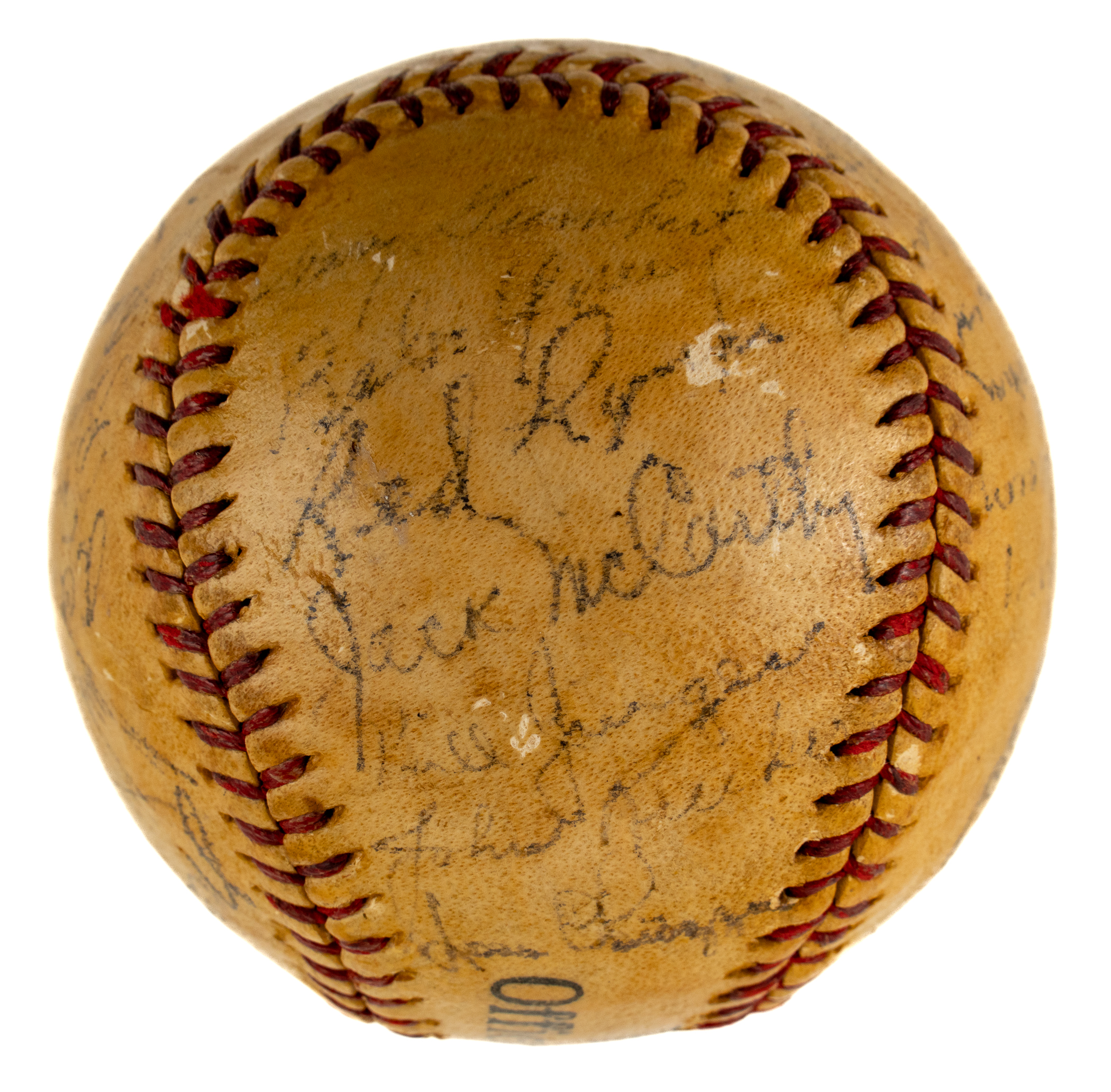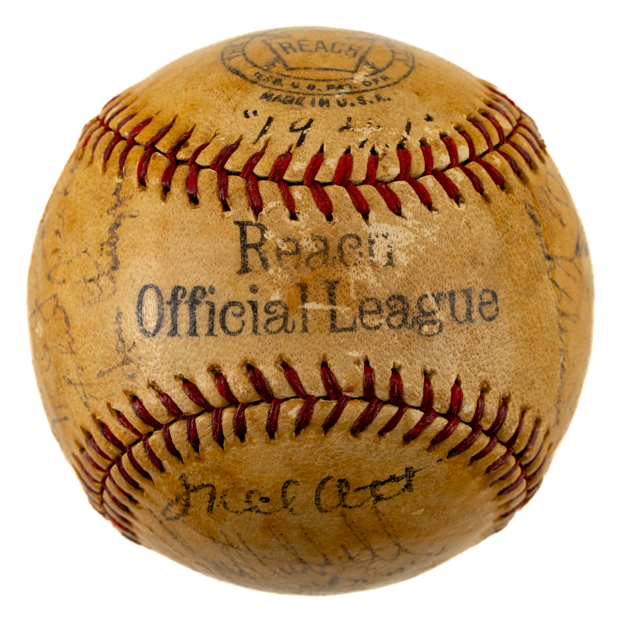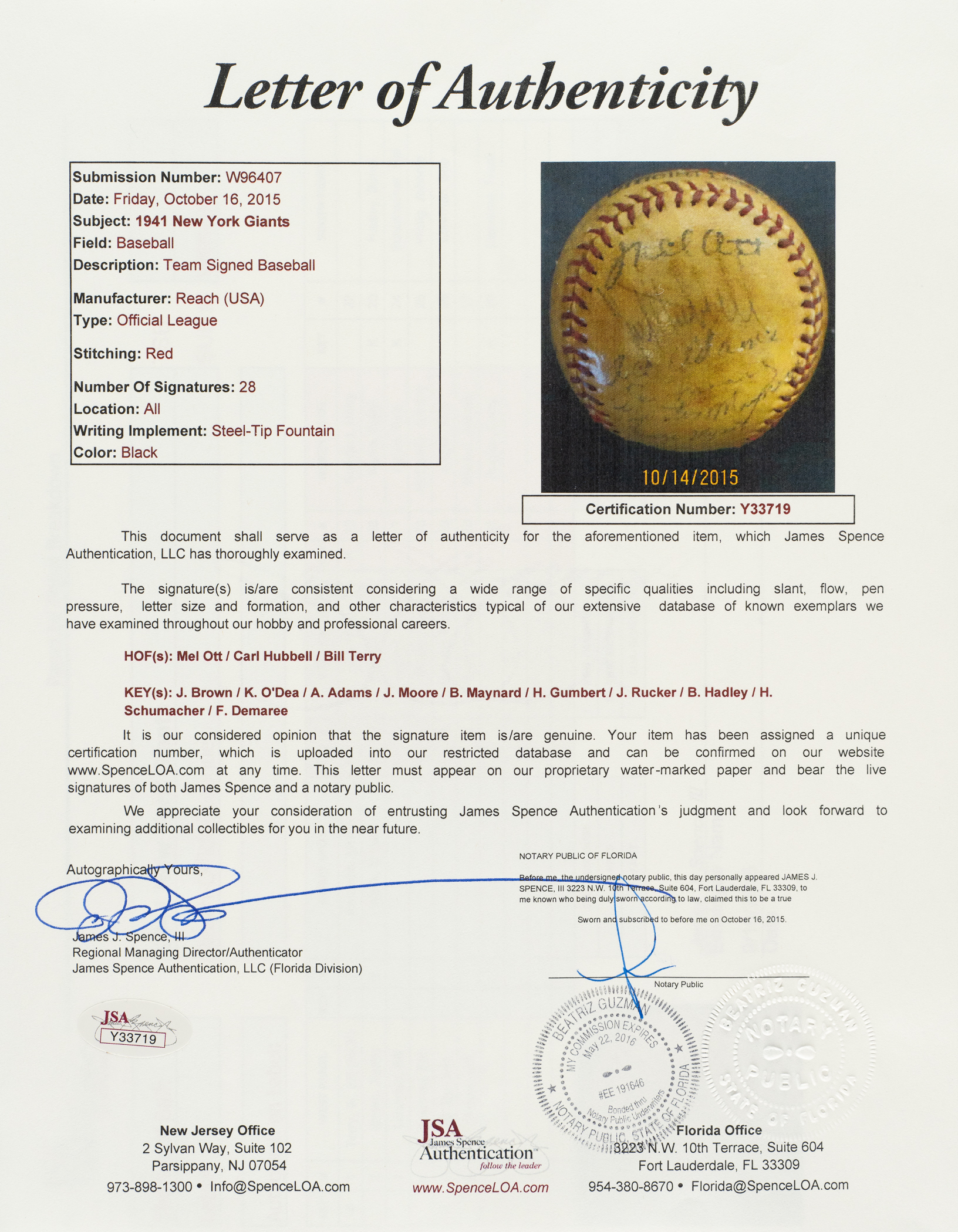 Reach "Official League" baseball signed in black fountain pen by 28 members of the 1941 New York Giants, including Ott, Hubbell, Terry (mgr.), Brown, O'Dea, Adams, Moore, Maynard, Gumbert, Rucker, Hadley, Schumacher, and Demaree. Please note that while Maynard did not appear for the Giants in 1941, he was with New York's minor league affiliate (Jersey City) that season. The year "1941" is penned in black ink above the league stamping. The ball, which has been coated with a light layer of protective shellac, displays several small surface abrasions and is in Good condition overall. Full LOA from James Spence/JSA.