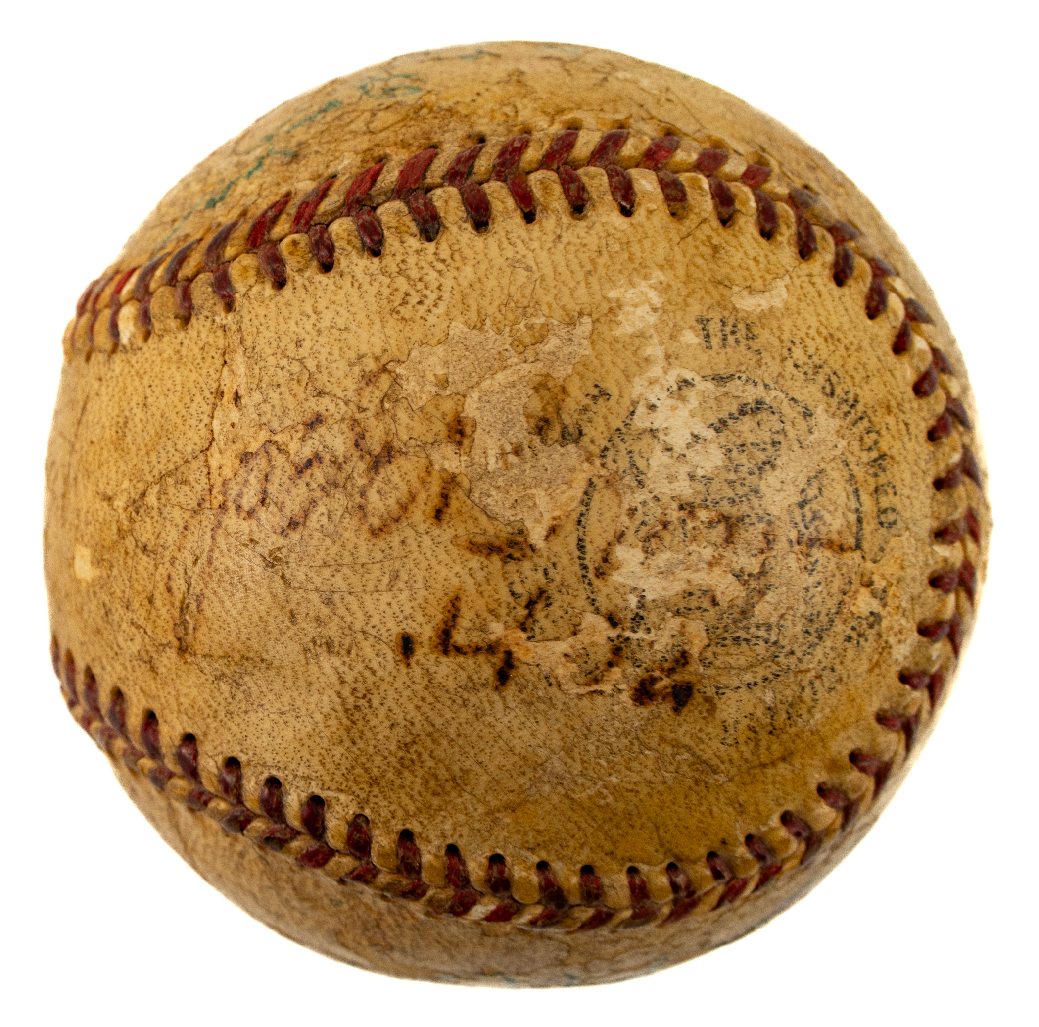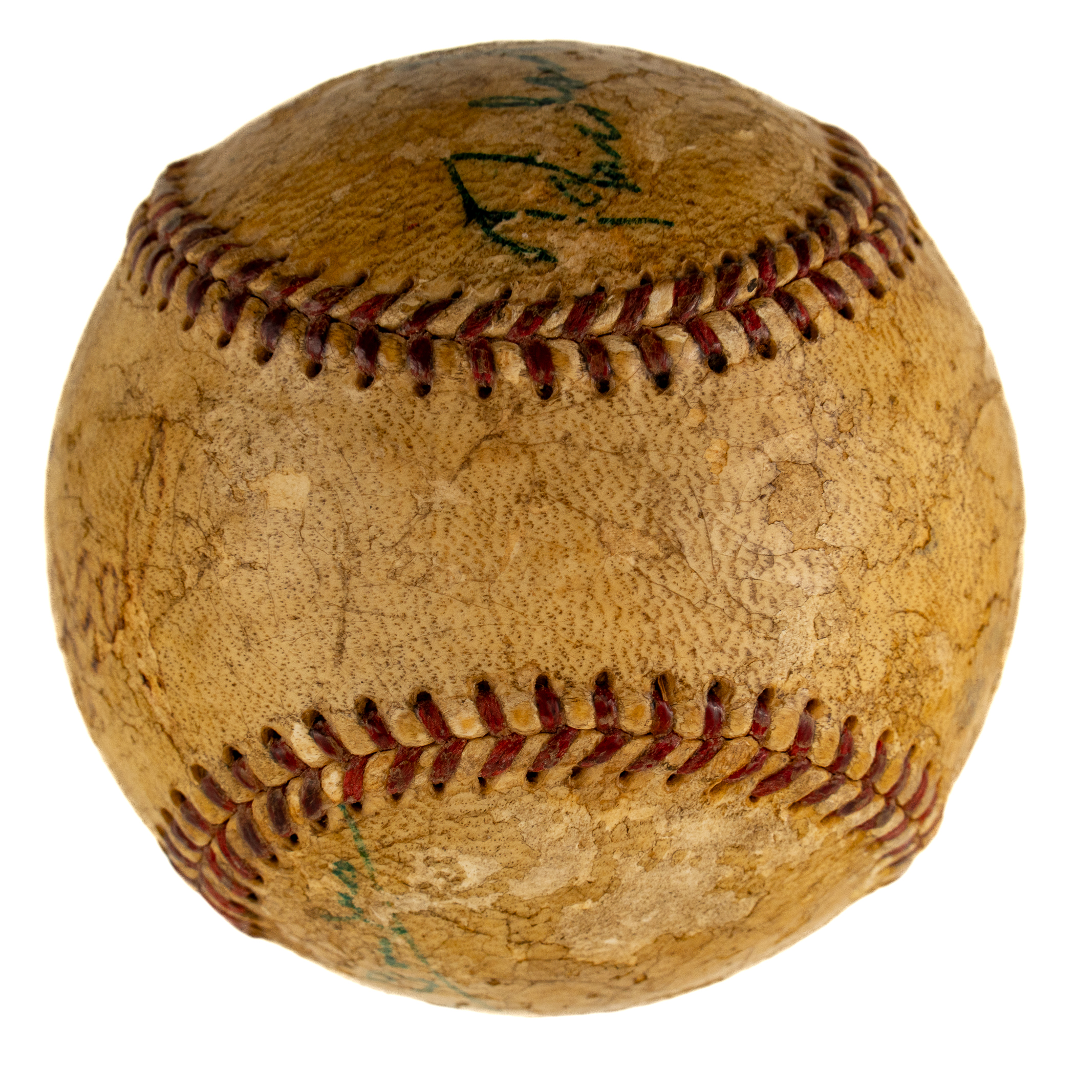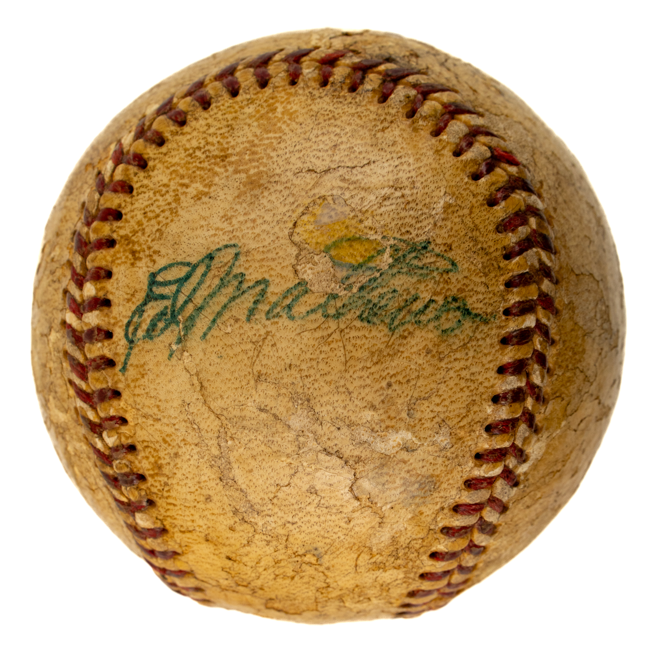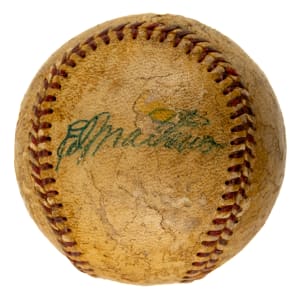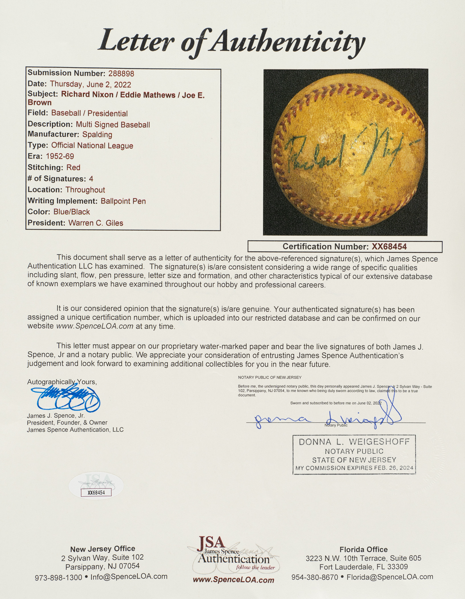 Official National League baseball (Giles) signed in blue and black ink by Richard Nixon (37th U.S. President), Eddie Mathews (baseball Hall of Famer), and Joe E. Brown (actor and comedian). The ball also contains one additional signature we were unable to identify. The ball, which has been coated with a light layer of protective shellac, displays several surface abrasions and is in Poor condition overall. Full LOA from James Spence/JSA.
