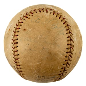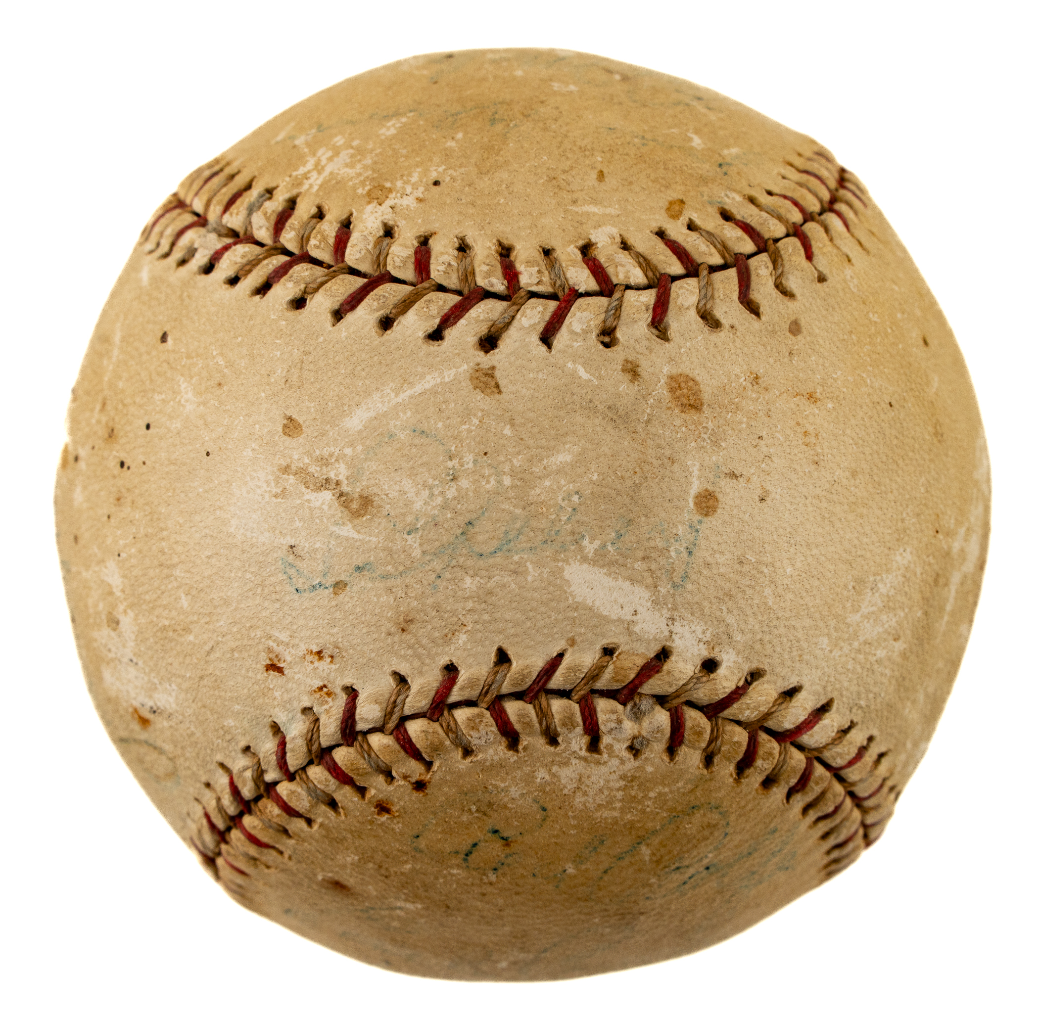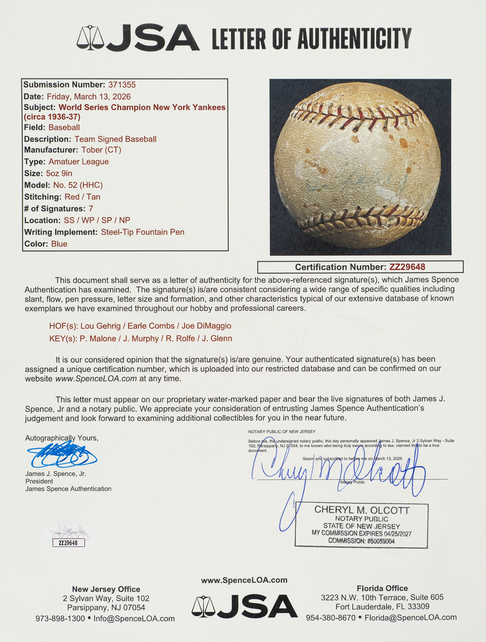 Tober "Amateur League" baseball signed in blue fountain pen by seven members of the circa 1936 New York Yankees. All of the signatures are faint, but those of Lou Gehrig on the sweet spot and Joe DiMaggio on a side panel remain easily legible. The other discernible signatures are those of Earle Combs (coach), Red Rolfe, Pat Malone, Joe Glenn, and Johnny Murphy. The ball displays moderate toning, with a number of small abrasions. In Very Good condition overall. Full LOA from James Spence/JSA.