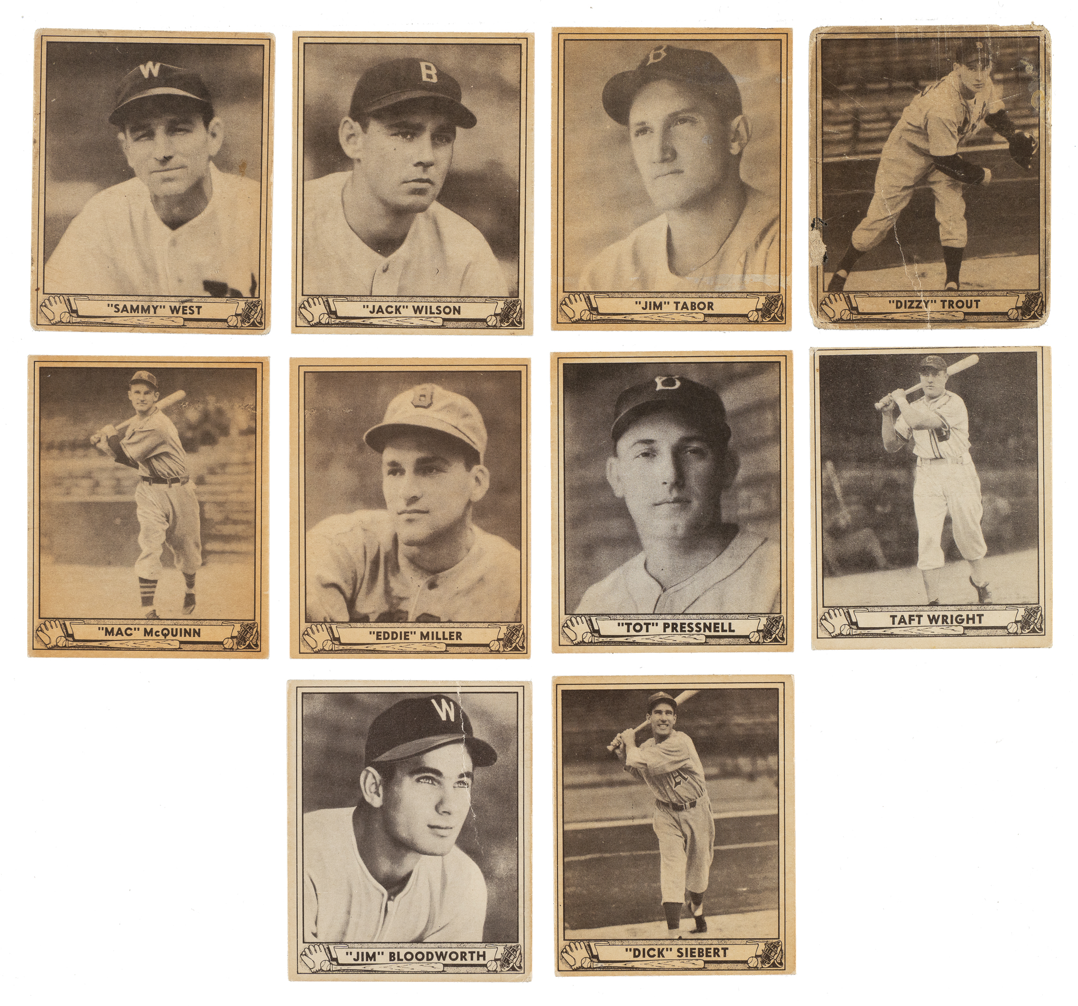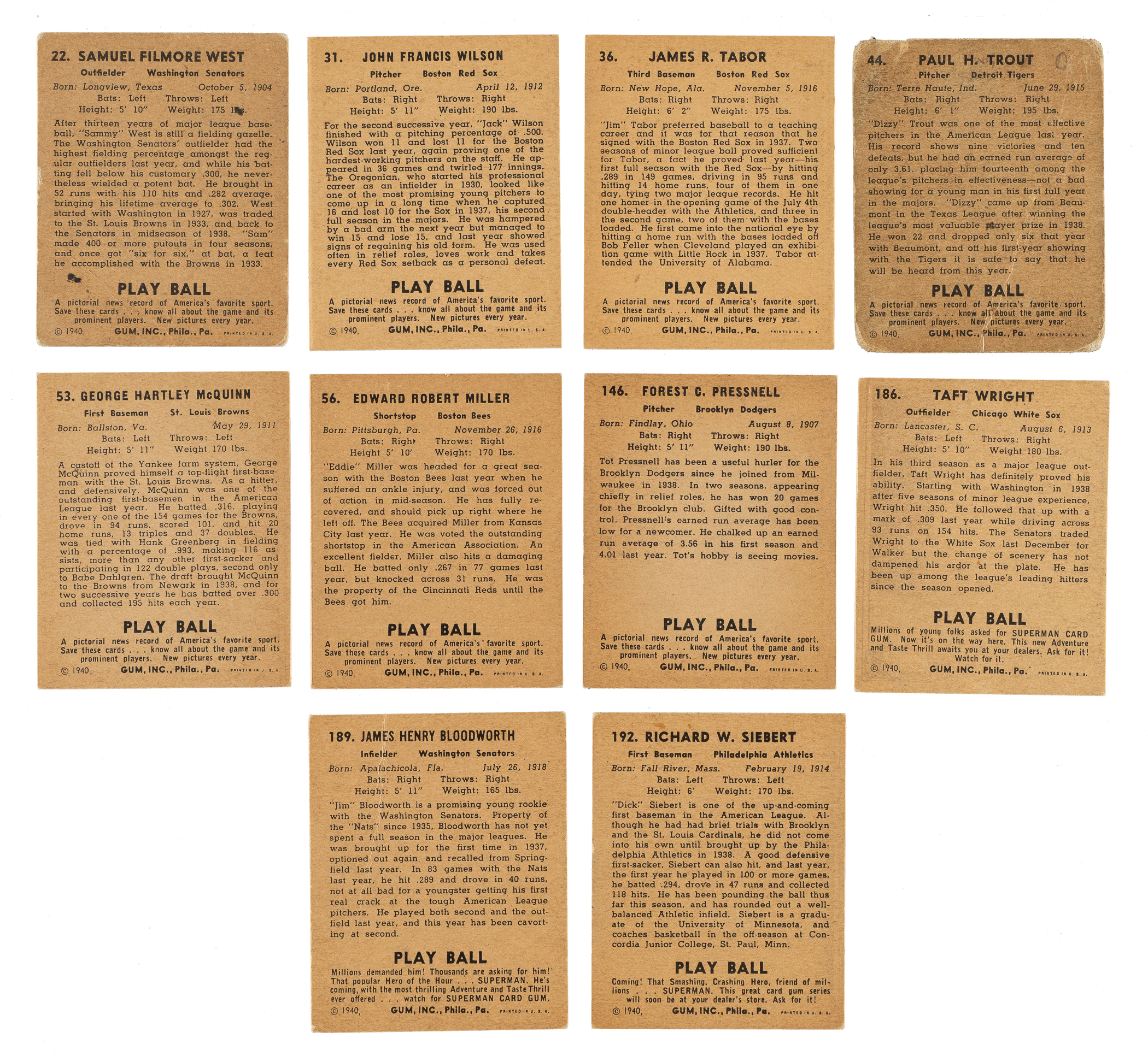 Collection of fourteen different 1940 R335 Play Ball cards, highlighted by Hall of Famers Waite Hoyt, Grover Alexander, and Heinie Manush. Condition is four Ex, four Vg-Ex, three Gd, and three lesser. This collection consists of the following: #4 Henrich (Ex), 22, 31, 36, 44, 53, 56, 118 Hoyt (Pr), 119 Alexander (tiny pencil mark on reverse, otherwise Vg), 146, 176 Manush (Ex), 186, 189, and 192. Total: 14 cards.