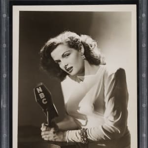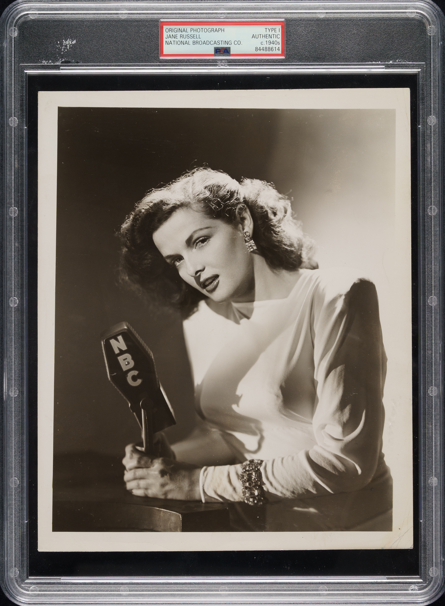 Original photo of Jane Russell, circa 1940s. Encapsulated and certified as an original Type I photograph by PSA/DNA. Photo courtesy of National Broadcasting Co. Measuring 8 x 10 inches, the photo displays a pair of date stamps (May 3, 1964, and Apr 24, 1964) and has Russell's name written in pencil on the reverse. Good to Very Good condition overall.