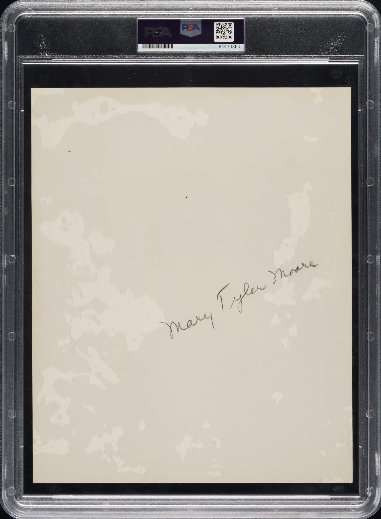 Original photo of Mary Tyler Moore in 1965. Encapsulated and certified as an original Type I photograph by PSA/DNA. Photo courtesy of Universal Pictures Co. Measuring 8 x 10 inches, the photo displays Moore's name written in pencil on the back. Very Good to Excellent condition overall.