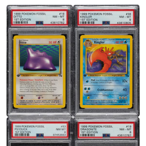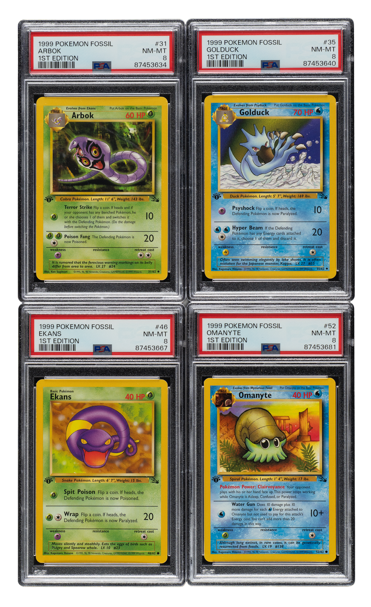 Collection of eight 1999 Pokemon Fossil 1st Edition cards, each graded and encapsulated NM-MT 8 by PSA. This collection consists of the following: #18, 19, 31, 35, 38, 46, 52, and 53. Total 8 cards.