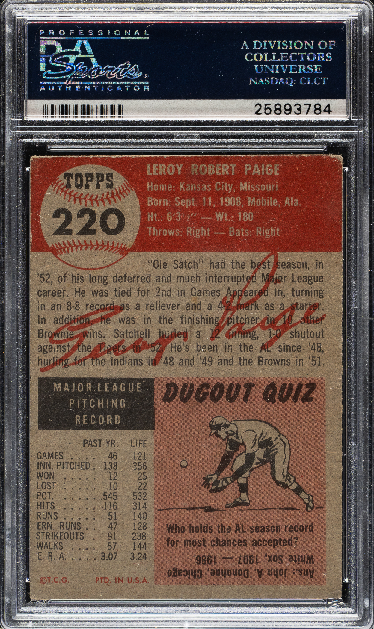 Graded VG 3 by PSA. St. Louis Browns Hall of Famer Satchell Paige.