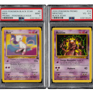 Pair of 2000 Pokemon Blackstar Mew & Mewtwo Promos, each graded and encapsulated by PSA. This pair consists of the following: 1) #8 Mew (MINT 9). 2) #14 Mewtwo (VG-EX 4). Total 2 cards.