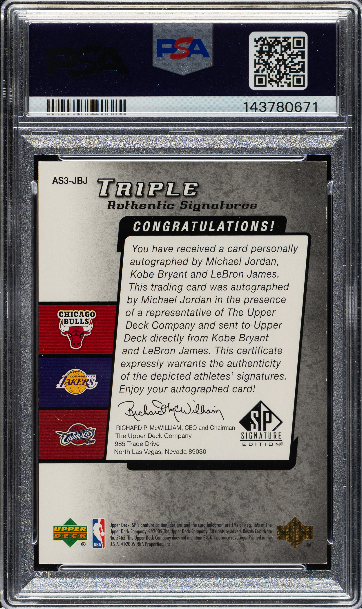 Graded EX 5 by PSA (submitted by REA). Presented is one of modern-card collecting's most coveted and prized signed inserts: a 2004-2005 Upper Deck SP Signature Triple Authentic Signatures card, featuring on-card autographs of Michael Jordan, Kobe Bryant, and LeBron James. Each player has boldly signed in blue-fine point marker on the gold foil panel adjacent to his respective image. Serial-numbered "12/25" above the signatures, this remarkable card unites three legends of the sport, each of whom has a legitimate "GOAT" claim. Together, they represent an unbroken lineage of modern basketball royalty, with Bryant serving as the generational bridge between Jordan's era and the league James would come to define. Naturally, cards signed by all three are exceedingly rare. From 2003 through 2010, Upper Deck issued 11 triple on-card autograph subsets of the trio, with total production exceeding only slightly more than 100 across all issues. Of those, fewer are known to be in circulation, and PSA has graded just 10 examples of this specific insert to date. This card presents as an exceptional mid-grade example, with the assigned grade largely attributed to the small wrinkle along the top edge of the reverse. Widely regarded as a grail piece within modern basketball collecting, this card would serve as a cornerstone in even the most advanced collections.