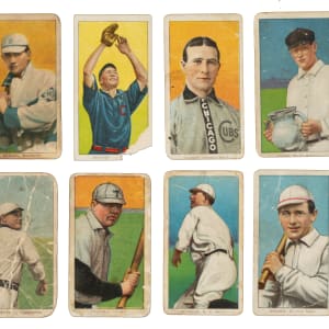 Collection of eight 1909-1911 T206 White Border cards, all featuring rare advertising backs: Tolstoi (2), Old Mill (5), and brown Hindu (1). Condition is Pr to Fr. This collection consists of the following: Bergen/batting (Old Mill), Bescher/hands in air (piece missing, Old Mill), Chance/portrait yellow background (Pr, Tolstoi), Chase/holding trophy (100/0 T/B, otherwise Fr, Old Mill), Delehanty (brown Hindu), Freeman (Old Mill), Seymour/throwing (Tolstoi), and Wagner/bat on right shoulder (Old Mill). Total: 8 cards.