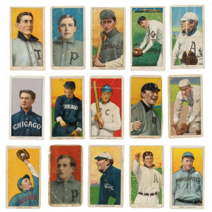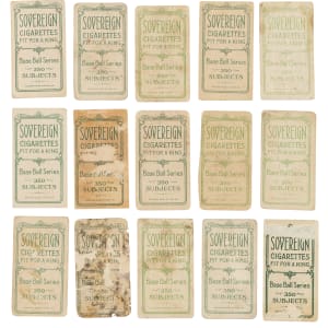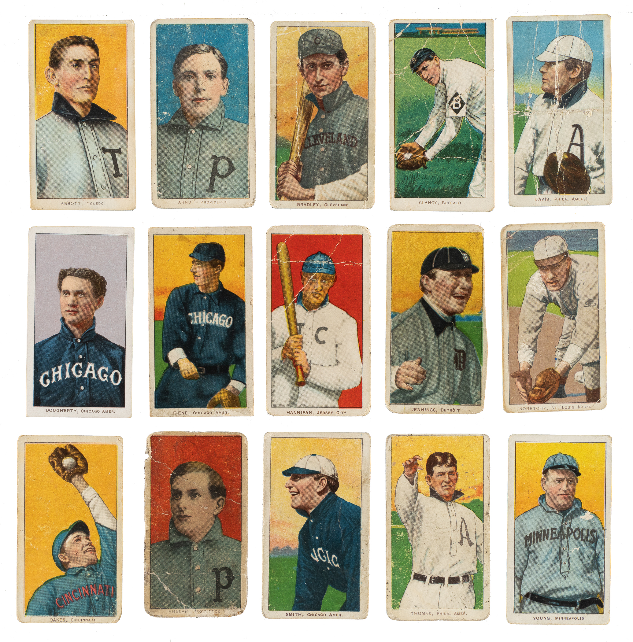 Collection of fifteen 1909-1911 T206 White Border cards, all featuring Sovereign advertising reverses. Condition is Pr to Fr overall, with one Gd and one Vg. This collection consists of the following: Abbott, Arndt, Bradley/with bat, Clancy, H. Davis/Davis on front, Dougherty/portrait, Fiene/throwing, Hannifan, Jennings/one hand showing (trimmed, otherwise Fr), Konetchy/glove near ground, Oakes, Phelan, F. Smith/Chicago, Thomas, and I. Young. Total: 15 cards.