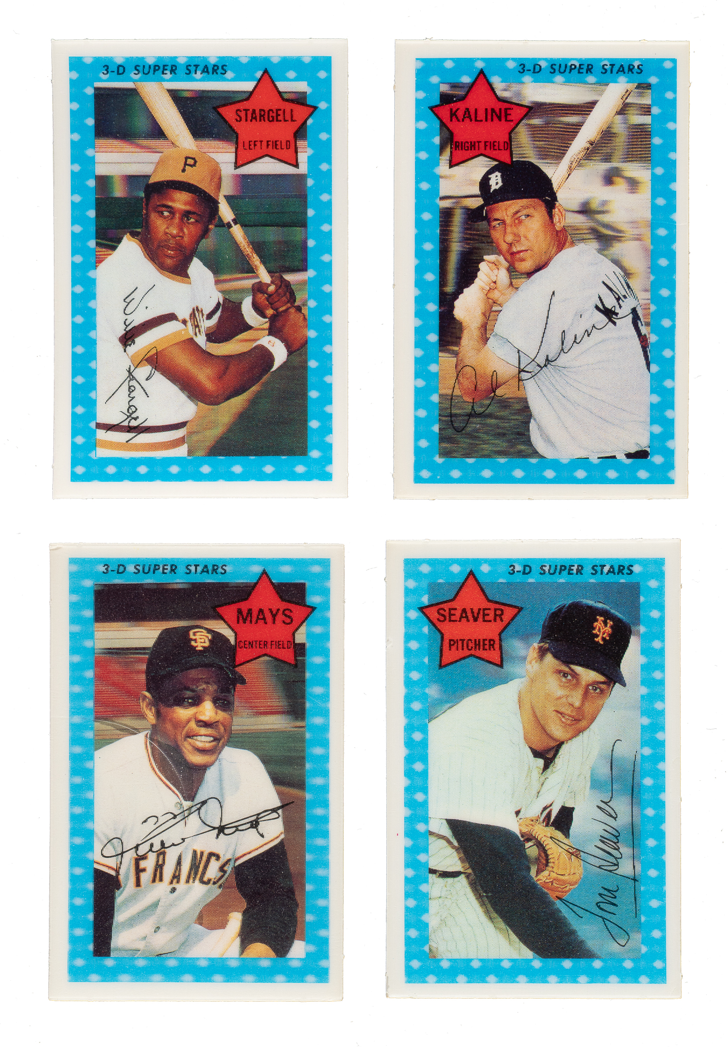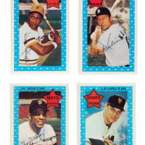 Partial set (42/75) of 1971 Kellogg's 3-D cards. Condition is 44% Nr/Mt to Nr/Mt-Mt (including a few Mint), 22% Vg to Vg-Ex (including two Ex to Ex-Mt), and 34% lesser (mostly due to cracking). Keys: #2 Seaver (Gd+), 10 Mays (Gd due to cracking), 15 F. Robinson (Nr/Mt-Mt+), 44 Kaline (Nr/Mt-Mt), 50 Banks (Fr-Gd due to cracking), 65 Rose (Gd due to cracking), and 68 Stargell (Mint). Missing the following thirty-three cards for completion: #3-5, 9, 14, 17, 20-25, 28, 34, 37, 38, 40, 41, 43, 46-48, 51, 53, 56, 57, 60, 62, 69-71, 73, and 74. Includes the following five duplicates: #7, 29, 63, and two 66. Total: 47 cards (partial set of 42 plus five duplicates).