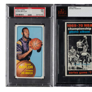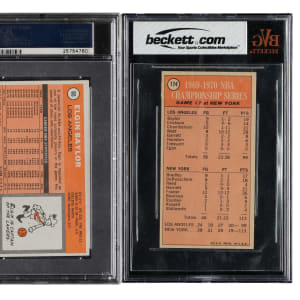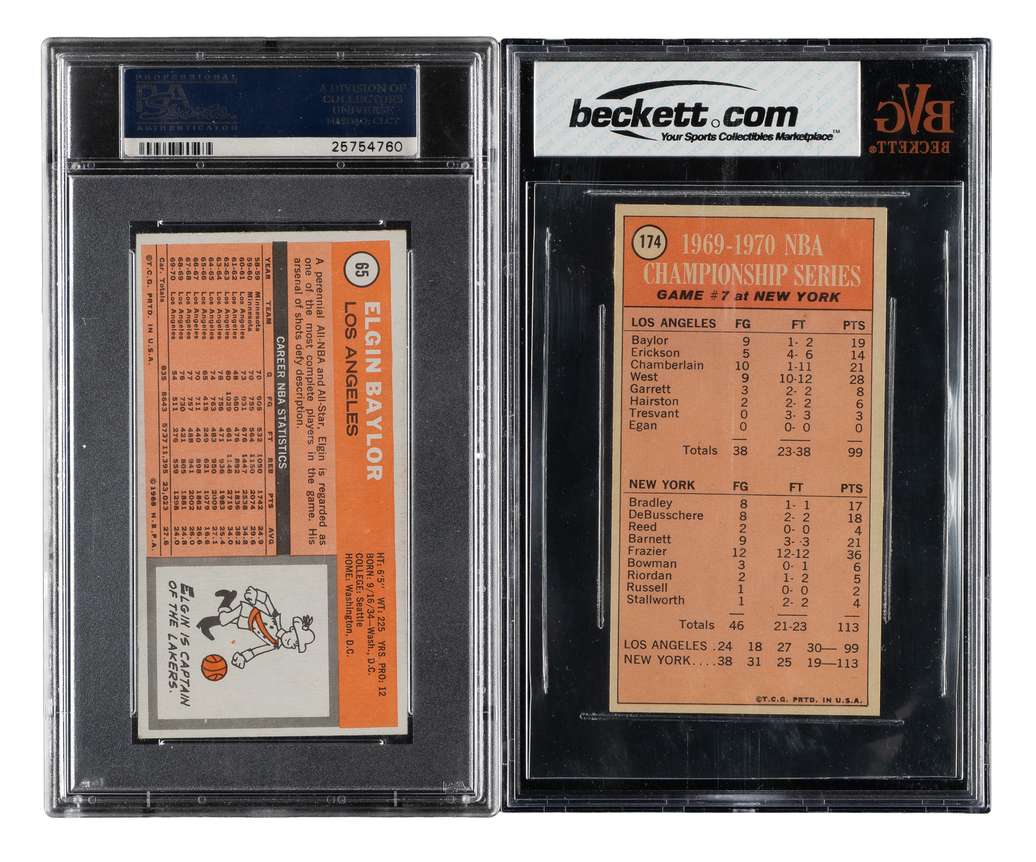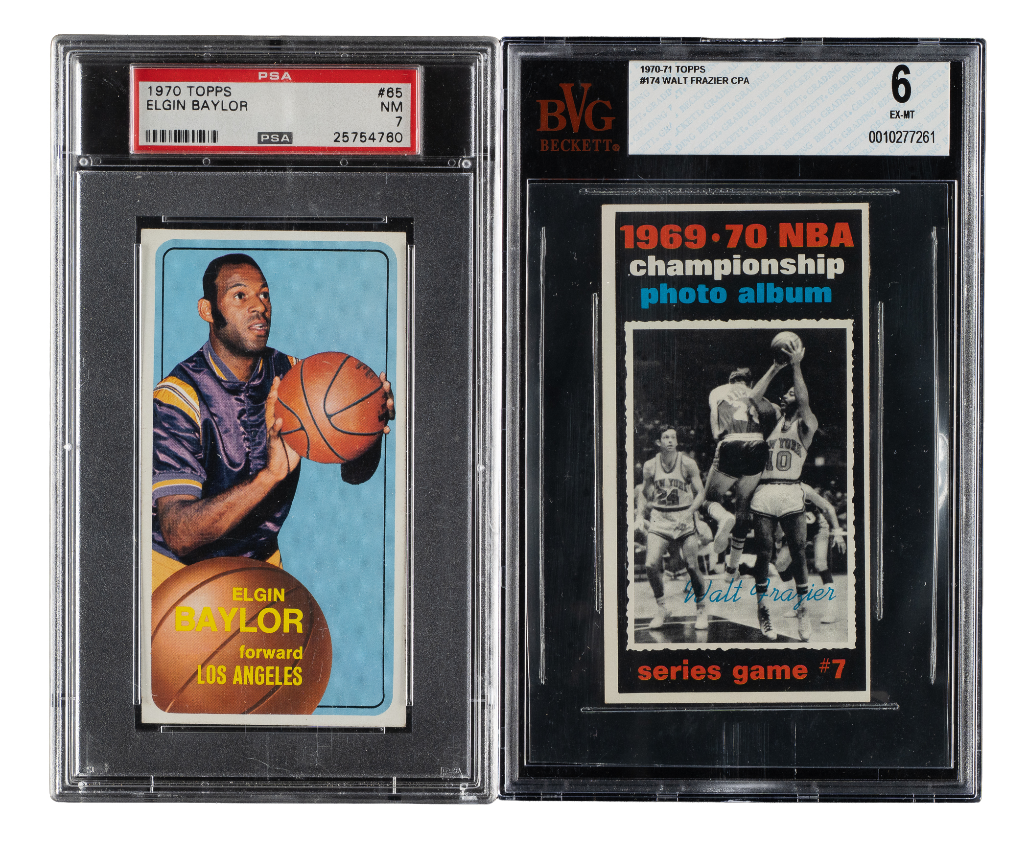 Pair of 1970-1971 Topps basketball cards, featuring New York Knicks and Los Angeles Lakers basketball Hall of Famers Walt Frazier and Elgin Baylor. Both cards have been graded and encapsulated by PSA or BVG. This pair consists of the following: #65 Baylor (NM 7) and 174 Frazier Playoff Game 7 (BVG EX-MT 6). Total: 2 cards.