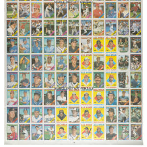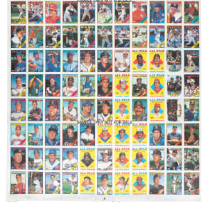 Extremely rare uncut sheet from the 1988 Topps Cloth Stickers Test issue. This 121-card sheet represents a complete set. The sheet is highlighted by several Hall of Famers and stars, including Tom Glavine (RC), Pete Rose, and Roger Clemens. Even among Topps test set collectors, few have ever encountered or are even familiar with this extremely rare set which uses the same images as the 1988 Topps set. Printed on thin cloth-like material, the blank-backed sheet (28 x 40 inches) displays natural creasing throughout but otherwise has an Excellent overall appearance. Also included is an identical paper-version of the offered sheet (only difference between the two sheets is that the cloth texture was not created on one). Please note: Both sheets have been stored rolled and will be shipped as such. The size/weight of this item requires that there will be an additional shipping charge for this lot.