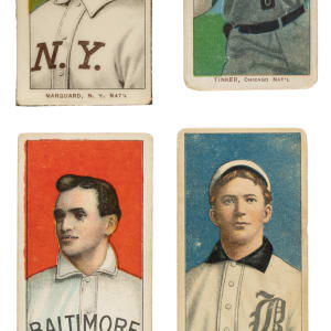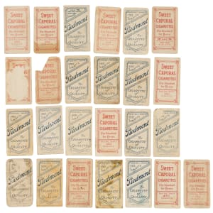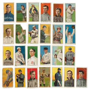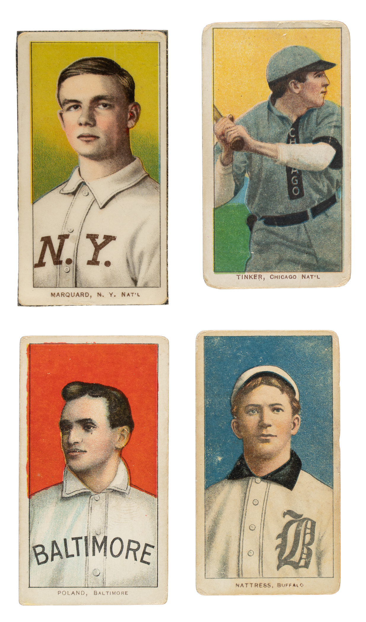 Collection of twenty-nine 1909-1911 T206 White Border cards, highlighted by Hall of Famers Rube Marquard and Joe Tinker. Condition is 20% Gd (including a couple Vg) and 80% Pr to Fr (including two trimmed). This collection consists of the following: Atz, Blackburne, Camnitz/hands above head, Carr, Criger, Devore, Doolin, Jack Dunn (piece missing), Fletcher, Hahn, Hulswitt, Knabe, Leach/portrait, Lord, Marquard/portrait (front has been laminated, otherwise Vg appearance), Mattern (trimmed, otherwise Gd), McQuillan/with bat, Murphy/throwing, Nattress, O'Brien, Phelps, Poland, Rhoades/hands at chest (trimmed, otherwise Pr), Rossman, Schlei/catching, F. Smith/Chicago, Stovall/portrait ("150" altered to "350"), Tinker/bat off shoulder (Pr), and Wright. Total: 29 cards.