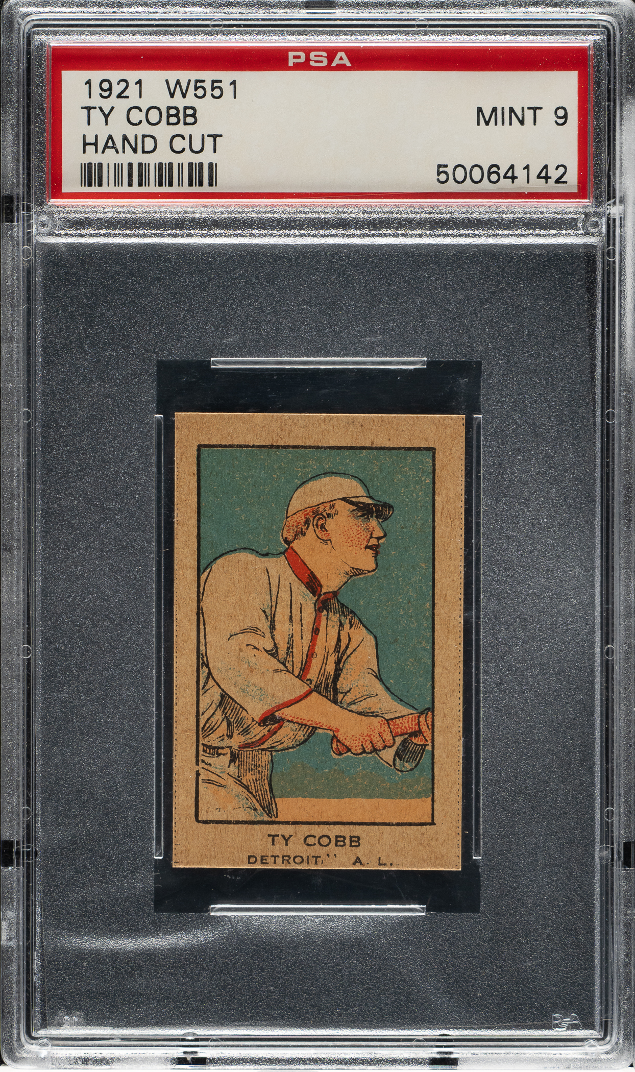 Graded MINT 9 by PSA. This is the ONLY example graded at this level by PSA with none higher! Extremely attractive ultra high-grade example of Detroit Tigers Hall of Famer Ty Cobb from the W551 strip-card series. Originally issued in strips, these cards (and almost all strip-cards) are often found with irregularly cut borders as they were cut by hand from the strips, as intended. Only ideally cut examples (which are few and far between) are awarded numerical grades by PSA (and SGC). The offered example is neatly cut, with strong corners, and a crisp image of Cobb set against a blue background. The blank back is entirely clean. This is a very desirable ultra high-grade example of one of Ty Cobb's most classic 1920s strip cards and one that would be an outstanding addition to any Ty Cobb, strip-card, or prewar-card collection.