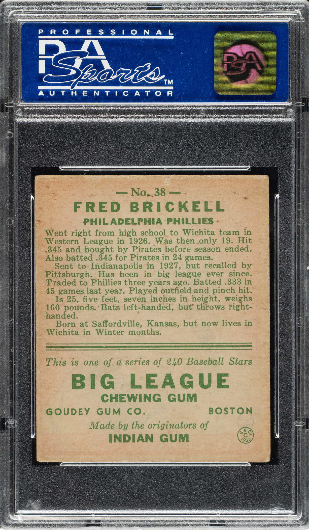 Lot # 1460: 1933 R319 Goudey #38 Fred Brickell PSA EX 5