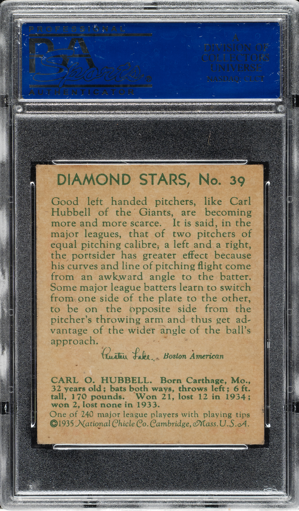 Lot # 1567: 1934-1936 R327 Diamond Stars #39 Carl Hubbell (1935 Green Back) PSA EX-MT 6