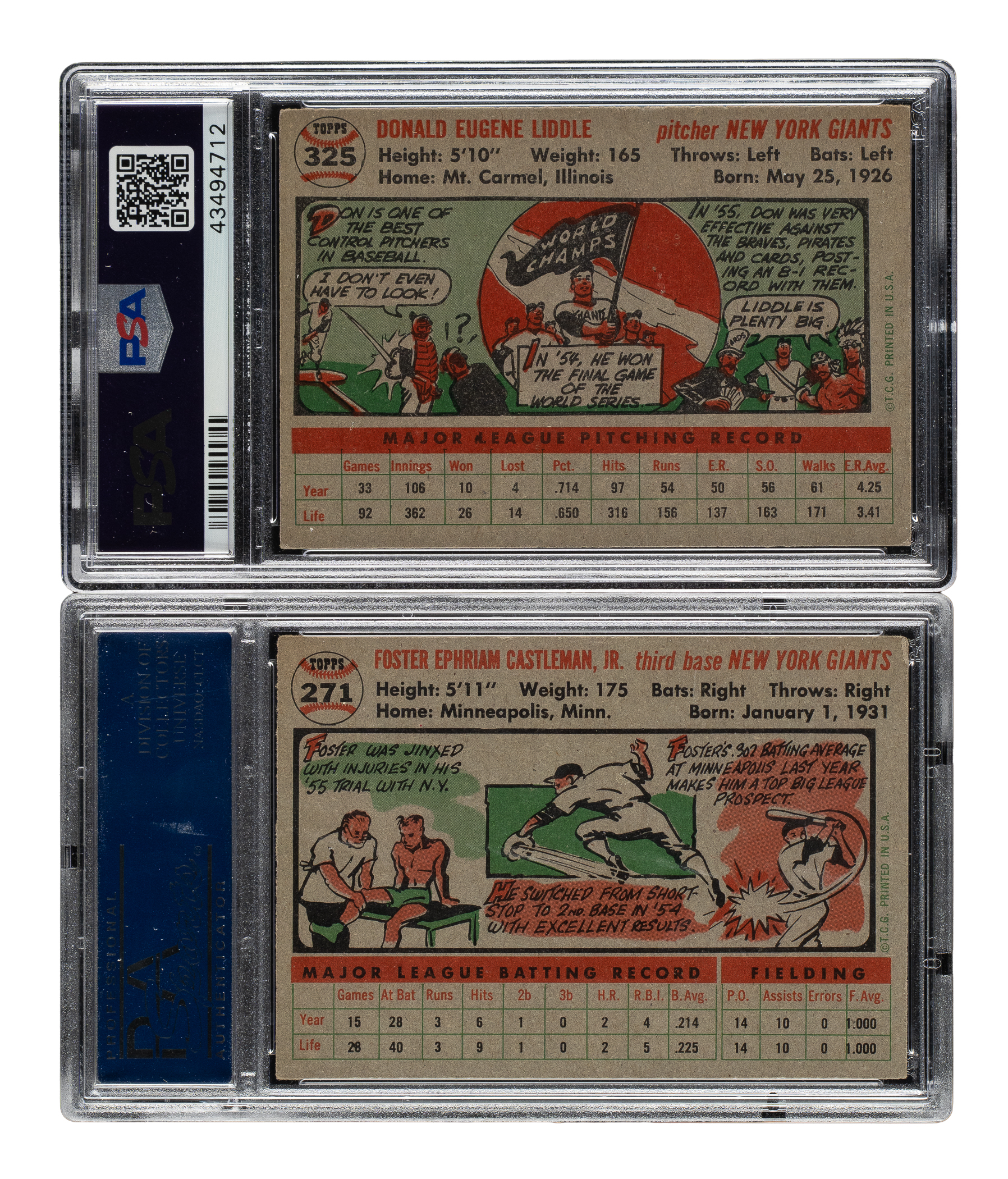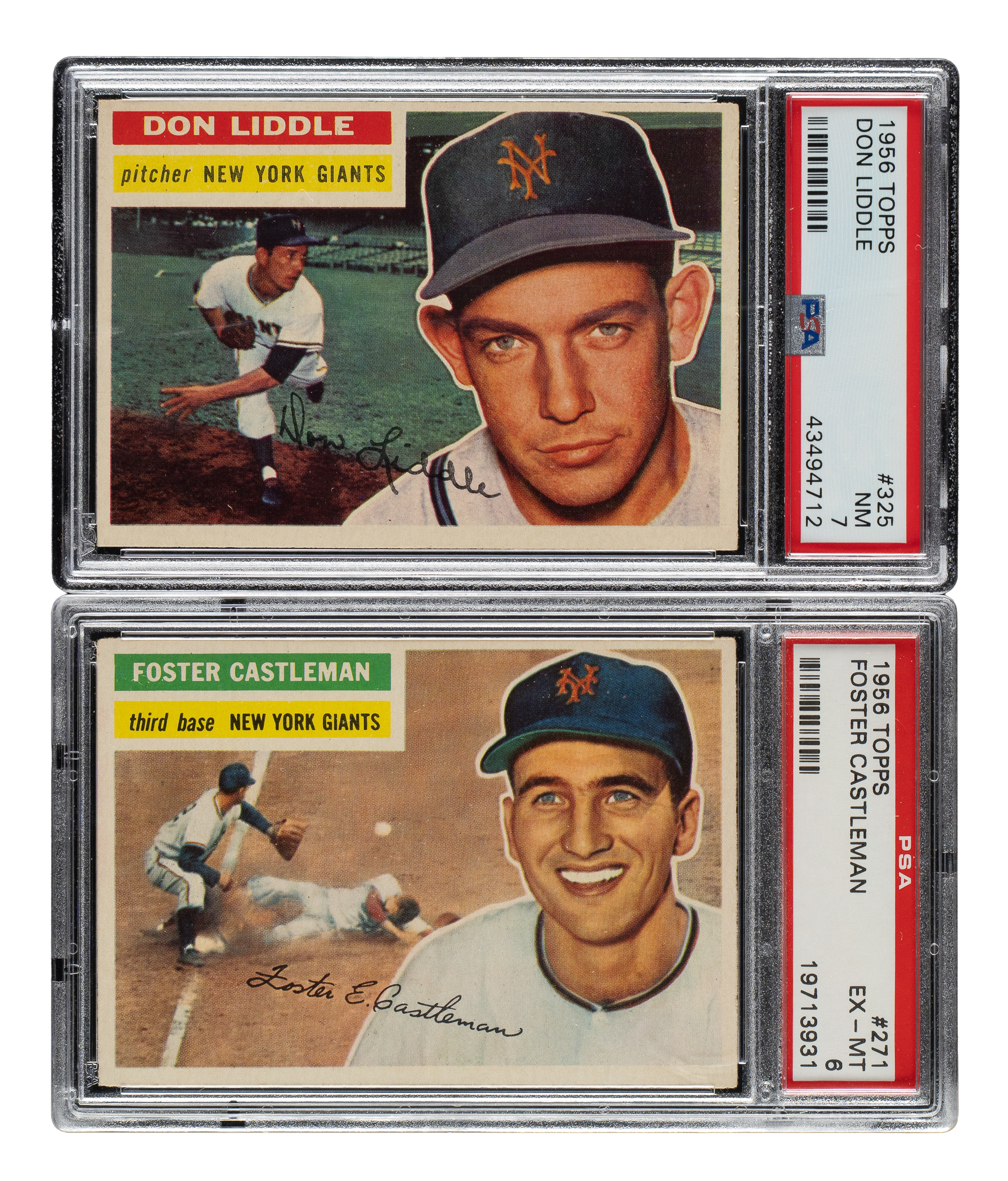 Pair of 1956 Topps cards, both graded and encapsulated by PSA. This pair consists of the following: #271 (EX-MT 6) and 325 (NM 7). Total: 2 cards.