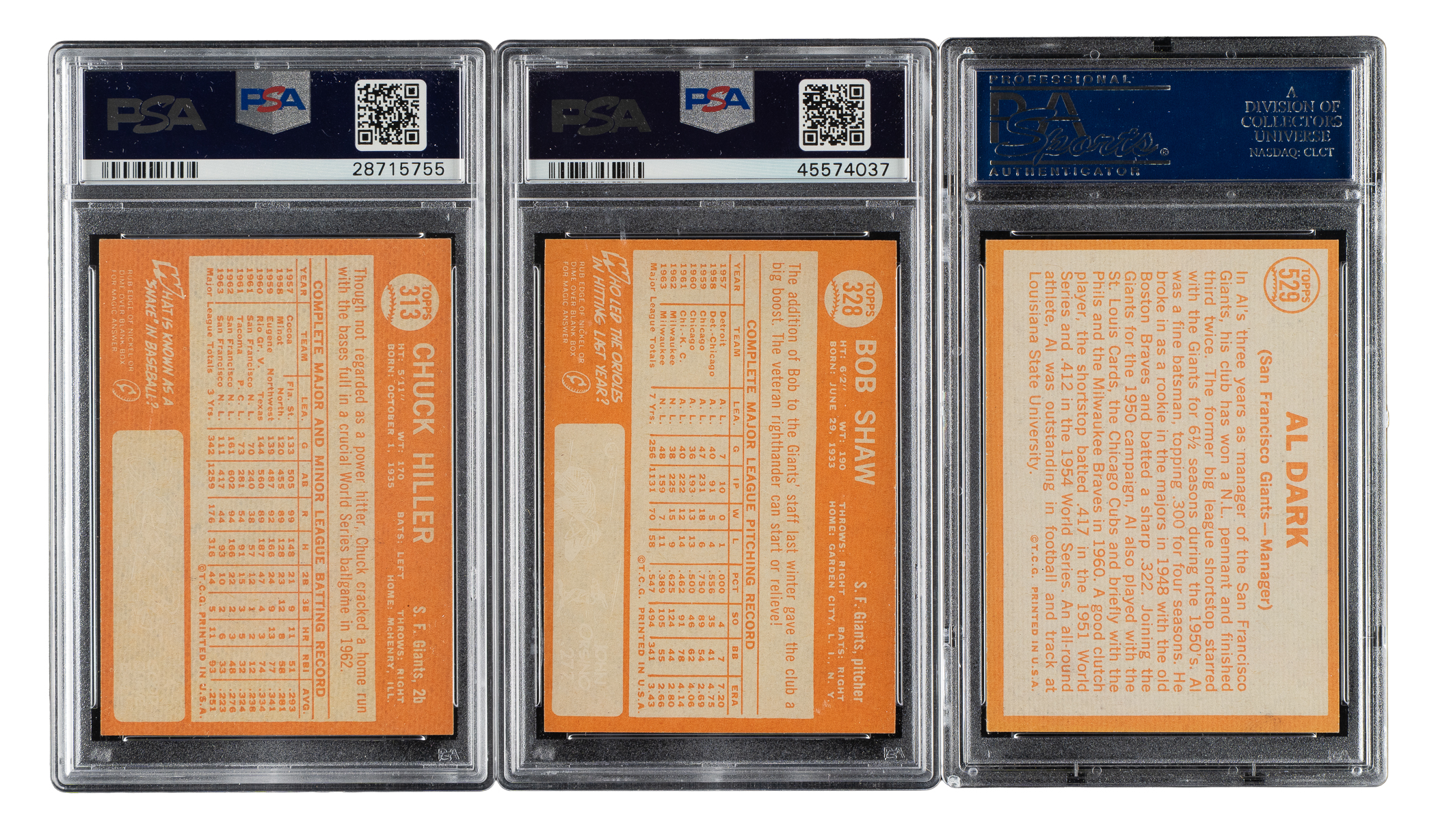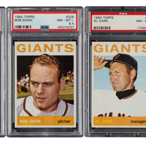 Lot # 2060: 1964 Topps PSA NM-MT+ 8.5 Trio: Chuck Hiller, Bob Shaw, and Al Dark