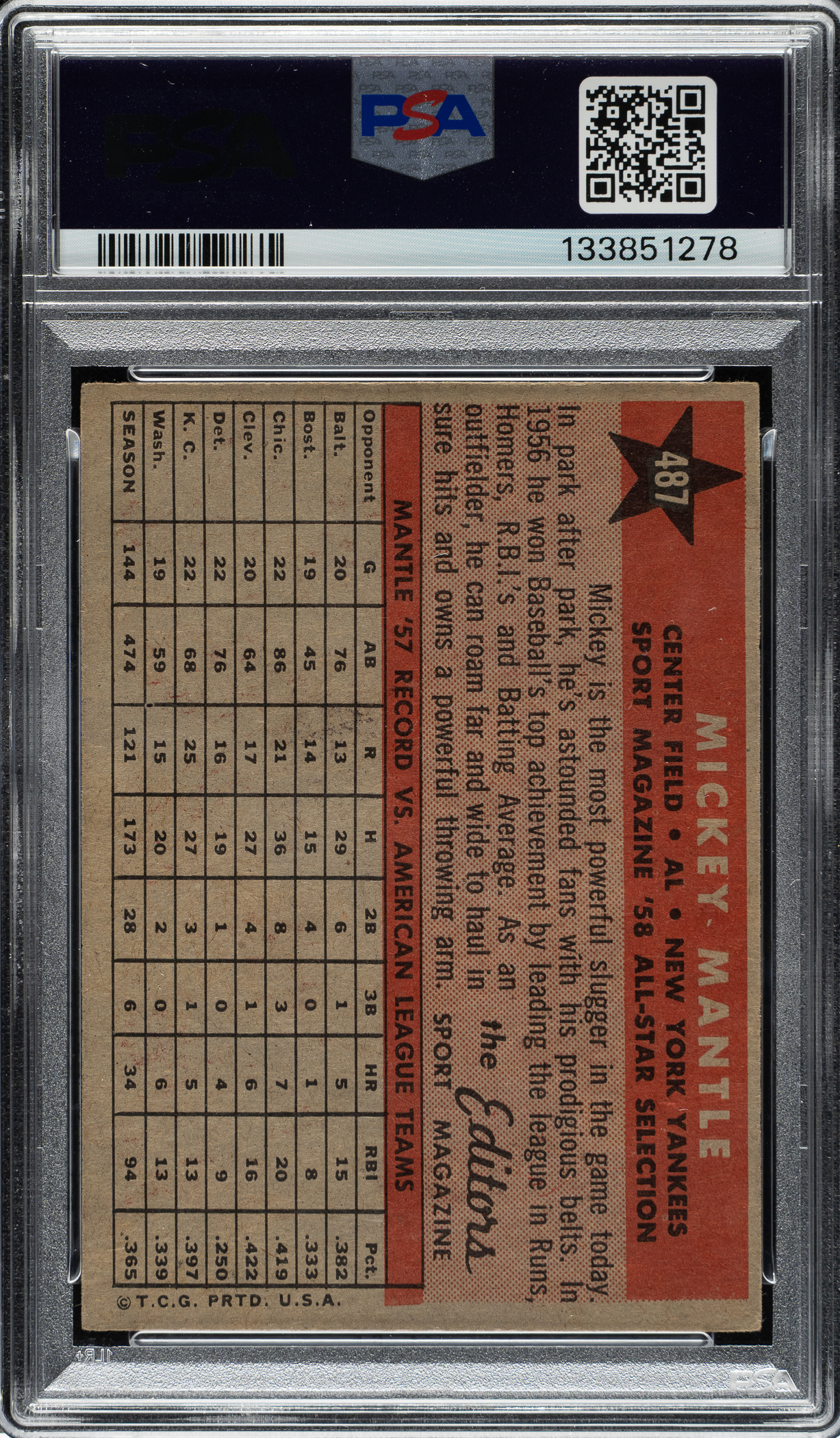 Lot # 1940: 1958 Topps #487 Mickey Mantle All-Star PSA VG-EX 4