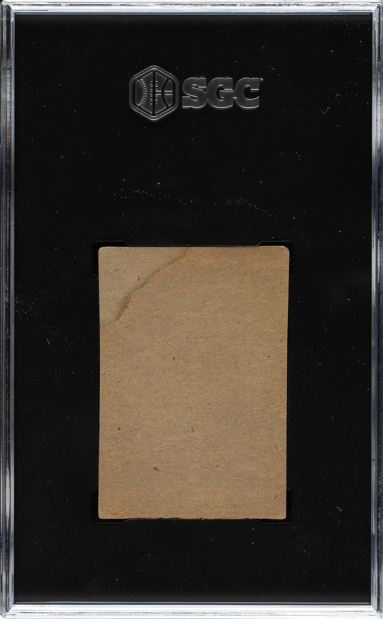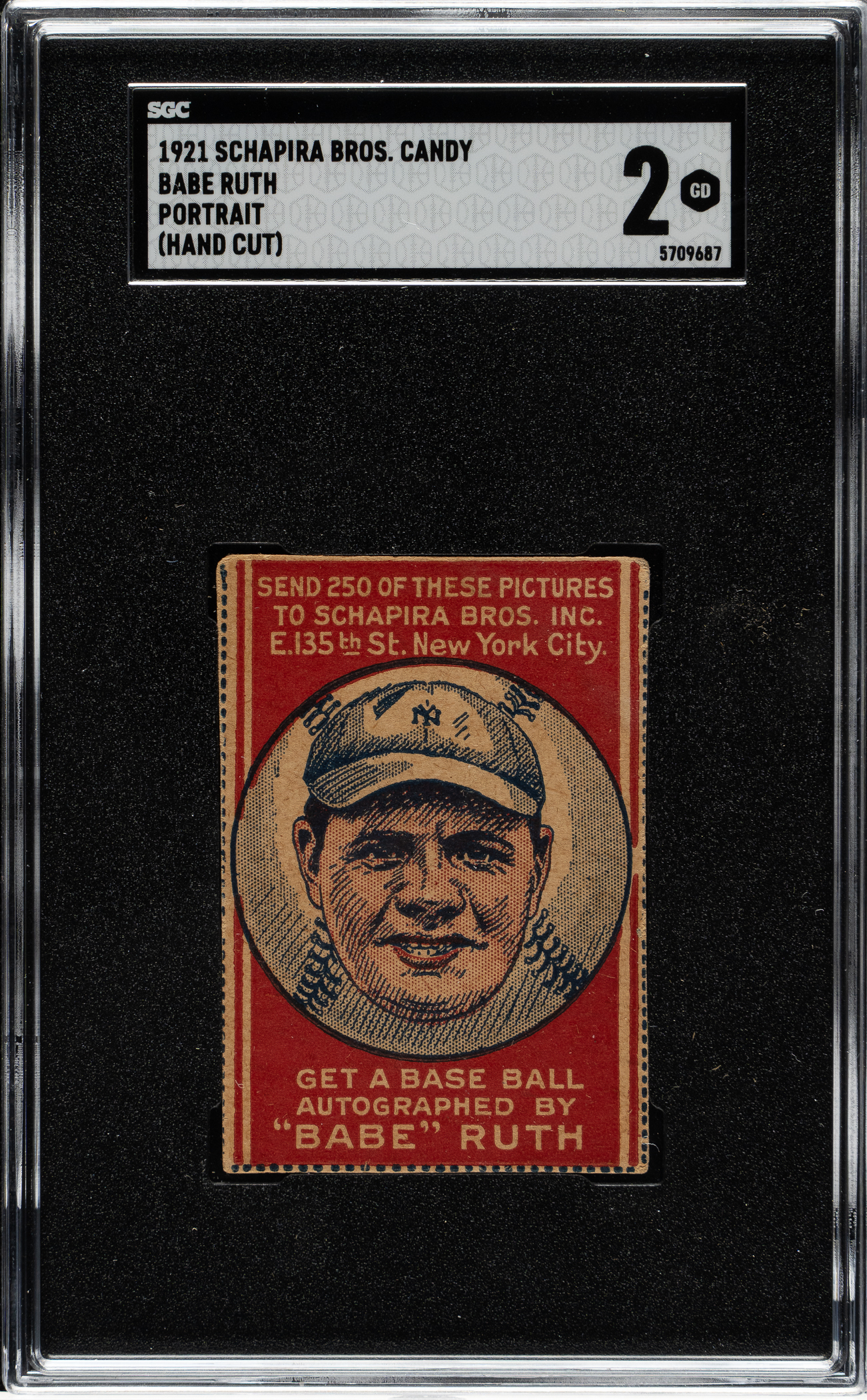 Graded GOOD 2 by SGC. Schapira Brothers, Inc. candy-box package-design portrait card featuring a crisp image of a smiling Babe Ruth within a baseball design, surrounded by a bold red background, neatly cut along the dotted lines. The offered card has honest corner wear and outstanding image registration. A light stain is visible on the reverse. One of Babe Ruth's classic cards. This is the signature card from a very unusual and fascinating candy-box set devoted exclusively to Babe Ruth. Each card from the set measures 1-5/8 x 2-3/8 inches and features Ruth. The portrait card appeared on one side of every box, and the other side featured one of five different full-length "action" cards with artwork that is clearly based on photos of Ruth. The portrait card is the only card in the set that identifies Ruth by name and provides instructions to "Send 250 of these pictures to Schapira Bros. Inc. E. 135th St. New York City" to "Get a Base Ball Autographed By Babe Ruth." There are few cards of Ruth dating from the 1920s. This is an attractive example of one of the most distinctive and interesting 1920s Ruth cards.
