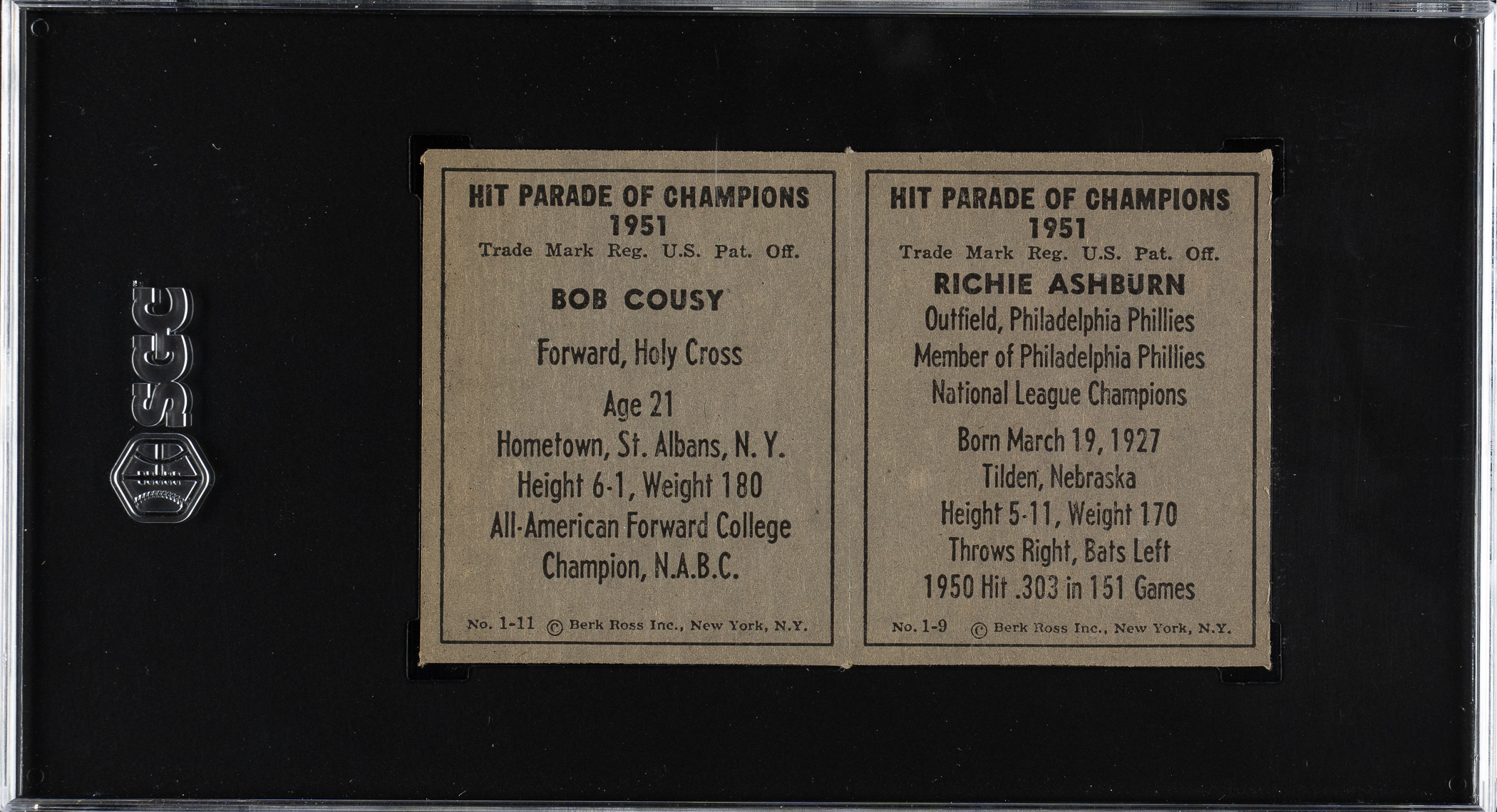 Graded VG/EX+ 4.5 by SGC. Philadelphia Phillies Hall of Famer Richie Ashburn and Boston Celtics basketball Hall of Famer Bob Cousy.