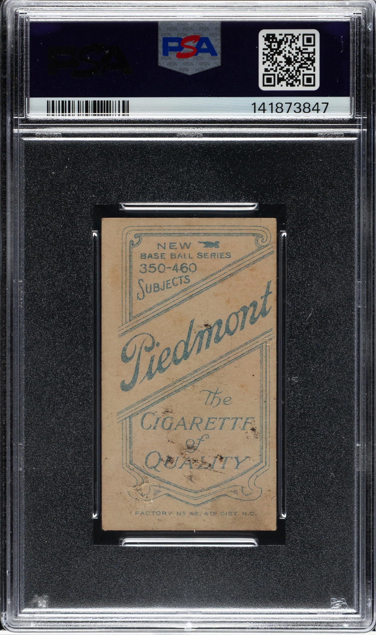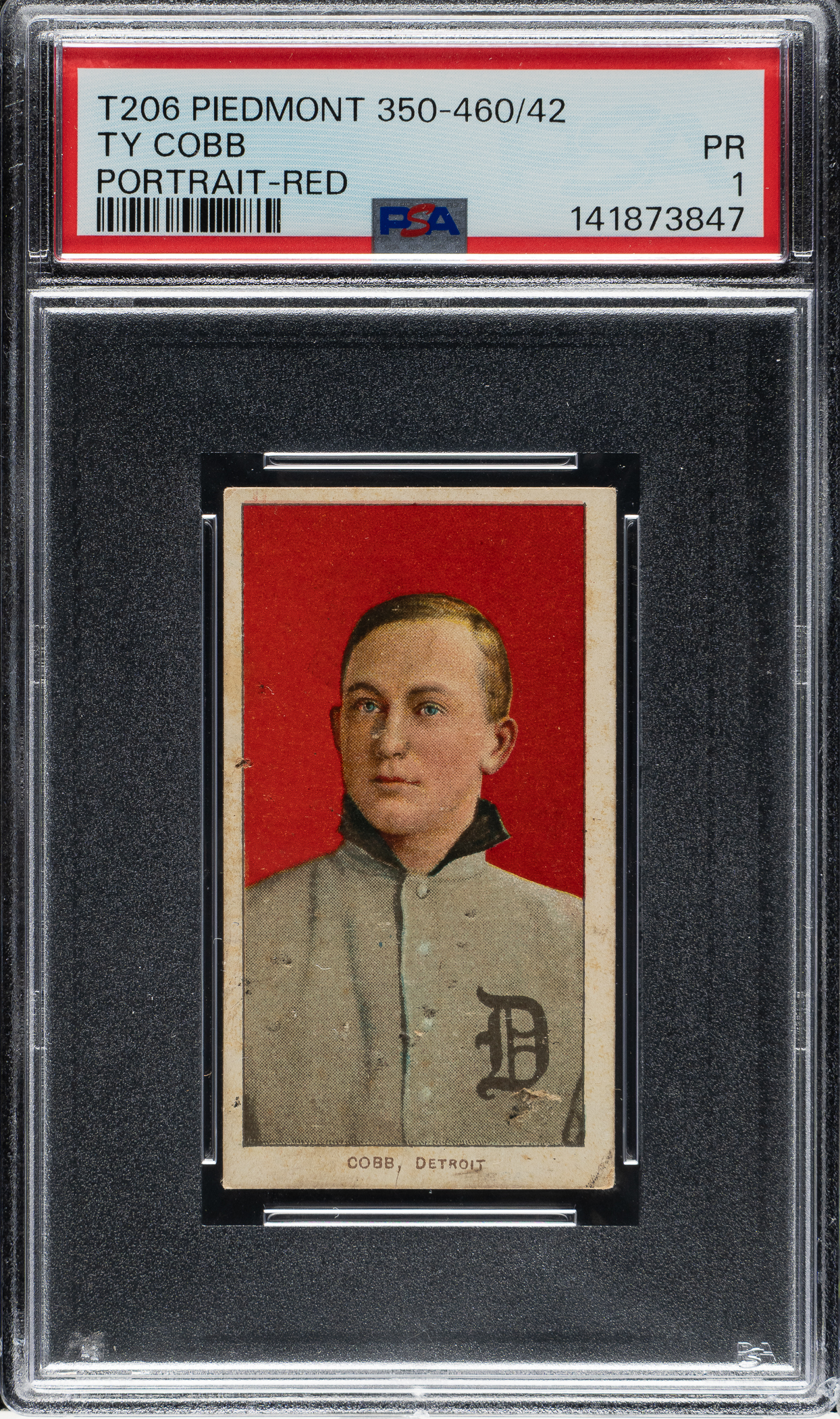 Modestly graded T206 White Border example of Detroit Tigers Hall of Famer Ty Cobb (portrait, red background) with a desirable Piedmont "Factory 42" designation on the reverse. This card has bold colors, excellent registration, and even corner wear. Graded POOR 1 by PSA due to several spots of surface damage and soiling on the back. Despite the flaws, this remains a very presentable low-grade example of one of the T206 set's iconic cards with this very scarce advertising back, ranked as the 12th most difficult (out of 39) within the set by T206Resource.com.