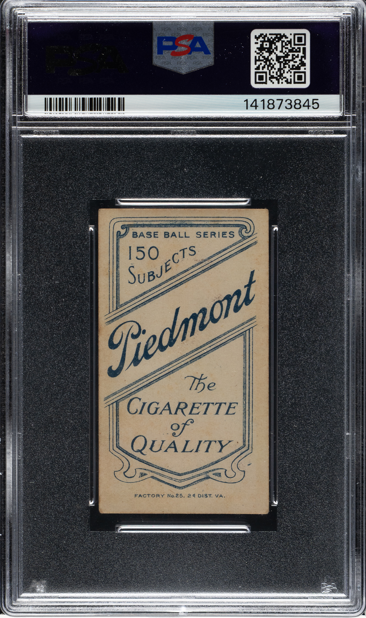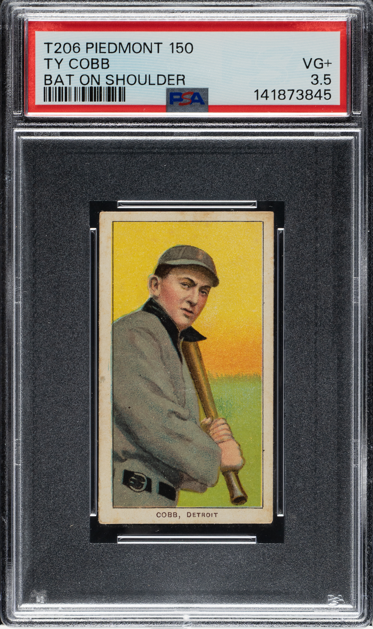 Graded VG+ 3.5 by PSA. Strong mid-grade example of this classic tobacco card of Detroit Tigers Hall of Famer Ty Cobb from the T206 White Borders series. The T206 Ty Cobb bat-on-shoulder pose is one of the key cards in the set. This well-centered card has beautiful colors, excellent registration, and even corner wear. Boldly printed Piedmont 150/25 advertising reverse.