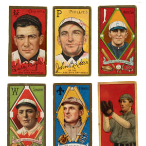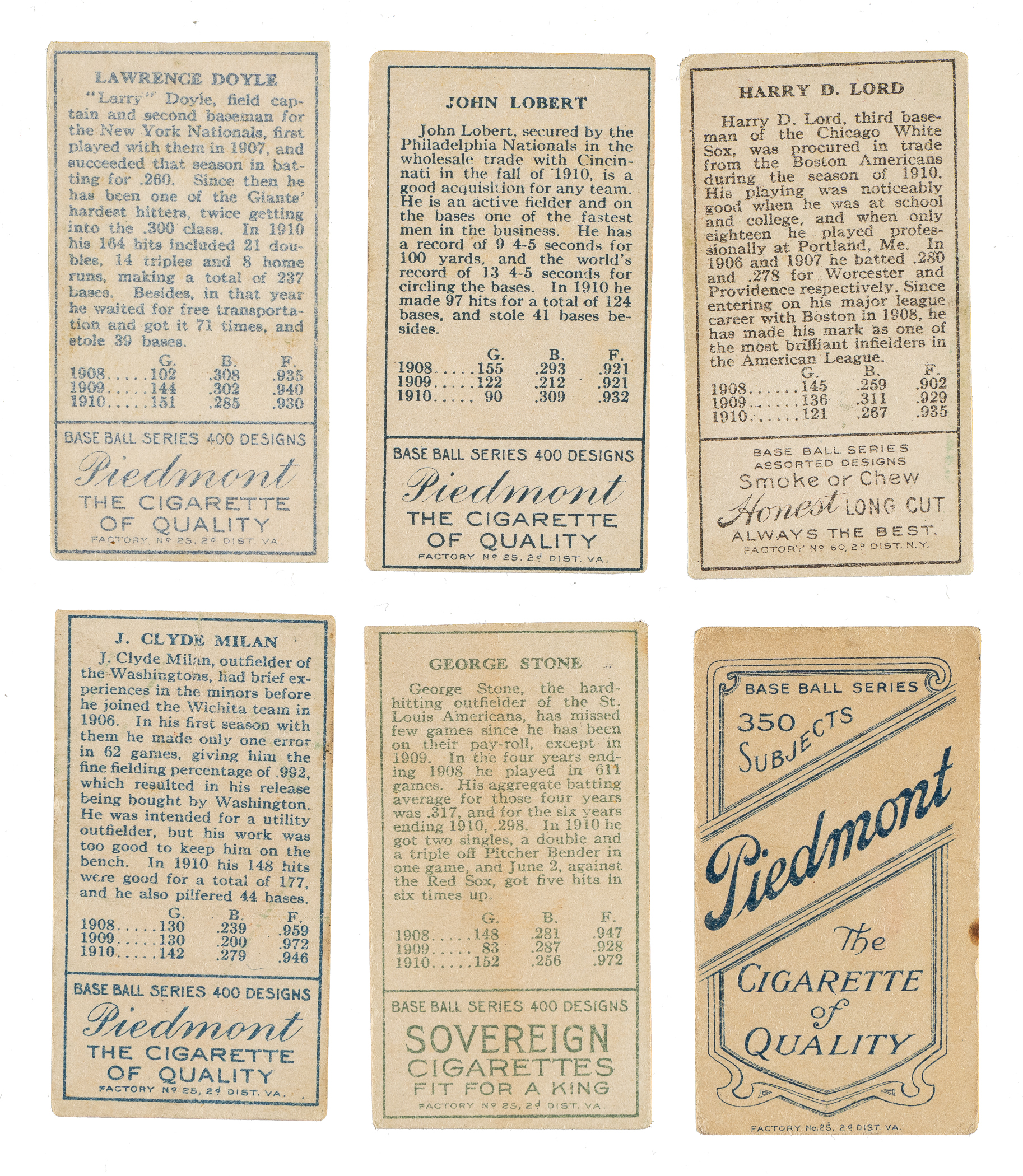 Collection of six 1909 to 1911 T205 Gold Border and T206 White Border cards. This collection consists of the following: 1) 1909-1911 T206 White Border (1 card): Cross (Gd). 2) 1911 T205 Gold Border (5 cards): Doyle (trimmed, otherwise Vg+), Lobert (trimmed and off-register red ink, otherwise Vg), H. Lord (trimmed, otherwise Vg), Milan (trimmed, otherwise Fr), and Stone (trimmed top edge, otherwise Vg-Ex, Sovereign back). Total: 6 cards.