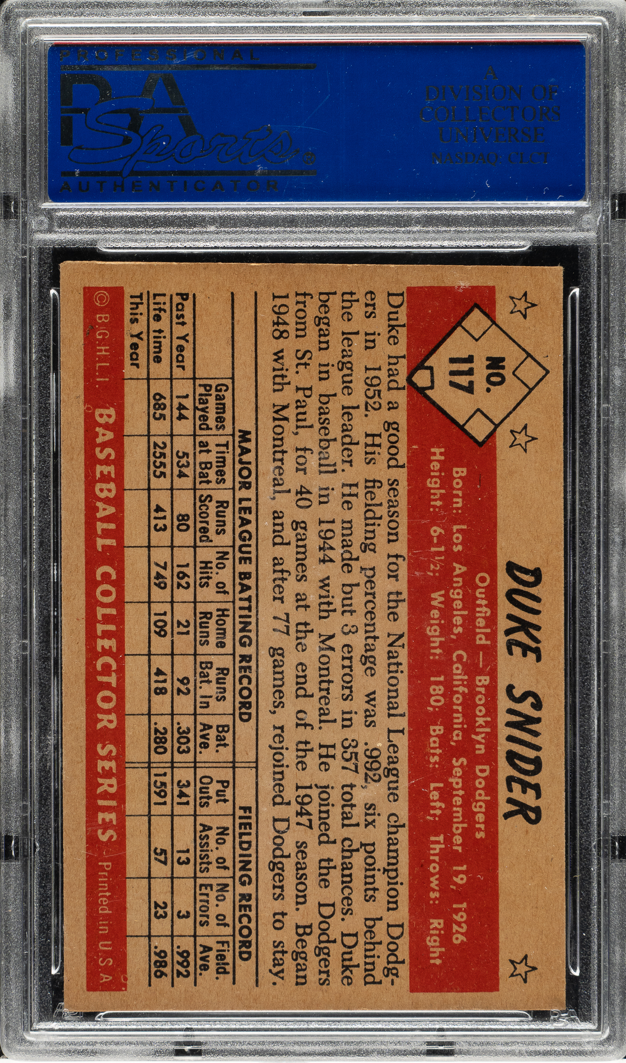 Graded EX-MT 6 by PSA. Brooklyn Dodgers Hall of Famer Duke Snider.
