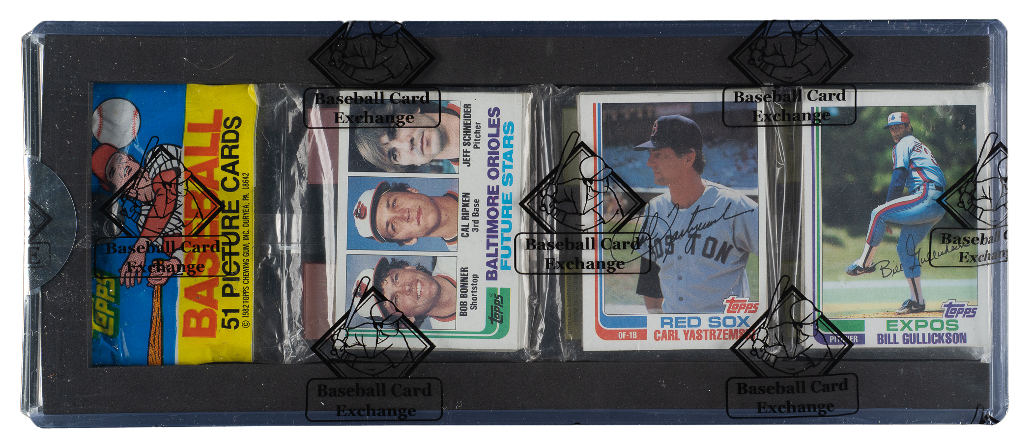 Original unopened rack pack from the 1982 Topps series with Hall of Famers Cal Ripken Jr. and Carl Yastrzemski showing on top. A total of 51 cards are enclosed in this rack pack. This pack comes shrink-wrapped by Baseball Card Exchange (owned by Steve Hart, the foremost expert on unopened material).