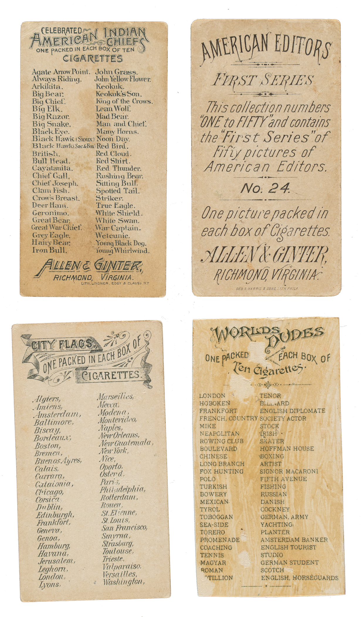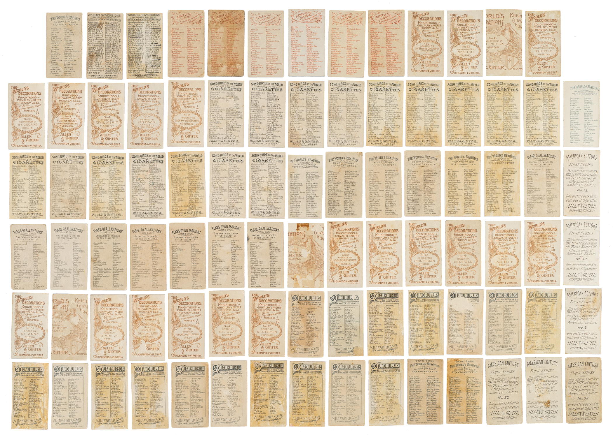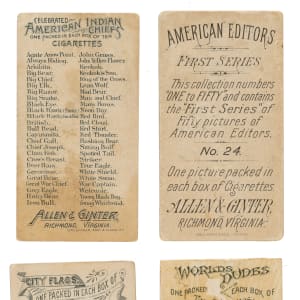 1) N1 American Editors (7 cards). 2) N2 Indian Chiefs (5 cards): Pr overall. Includes the following: Big Razor (slight trim to top edge), British/correct, Red Cloud, Spotted Tail, and White Shield. 3) N3 Arms of All Nations (6 cards). 4) N4 Birds of America (5 cards). 5) N5 Birds of the Tropics (5 cards). 6) N6 City Flags (4 cards). 7) N7 Fans of the Period (5 cards). 8) N8 Fish From American Waters (8 cards). 9) N9 Flags of all Nations - 1st Series (4 cards, including 3 different). 10) N10 Flags of All Nations - 2nd Series (32 cards, including 27 different). 11) N11 Flags of the States and Territories (5 cards). 12) N12 Fruits (1 card). 13) N13 Game Birds (12 cards). 14) N14 General Government and State Capitol Buildings of the United States (12 cards). 15) N17 Naval Flags (1 card). 16) N18 Parasol Drill (12 cards). 17) N20 Prize and Game Chickens (2 cards). 18) N21 Quadrupeds (17 cards). 19) N22 Racing Colors of the World (5 cards). 20) N23 Song Birds of the World (21 cards). 21) N26 The World's Beauties - 1st Series (6 cards). 22) N27 The World's Beauties - 2nd Series (2 cards). 23) N30 The World's Decorations (23 cards): Includes three cards hand cut from the larger format N44 "World's Decorations" series. 24) N31 World's Dudes (9 cards): Four cards are skinned, three are trimmed, and two grade Gd+. 25) N32 The World's Racers (7 cards). 26) N34 World's Sovereigns (2 cards): Gd and Pr.