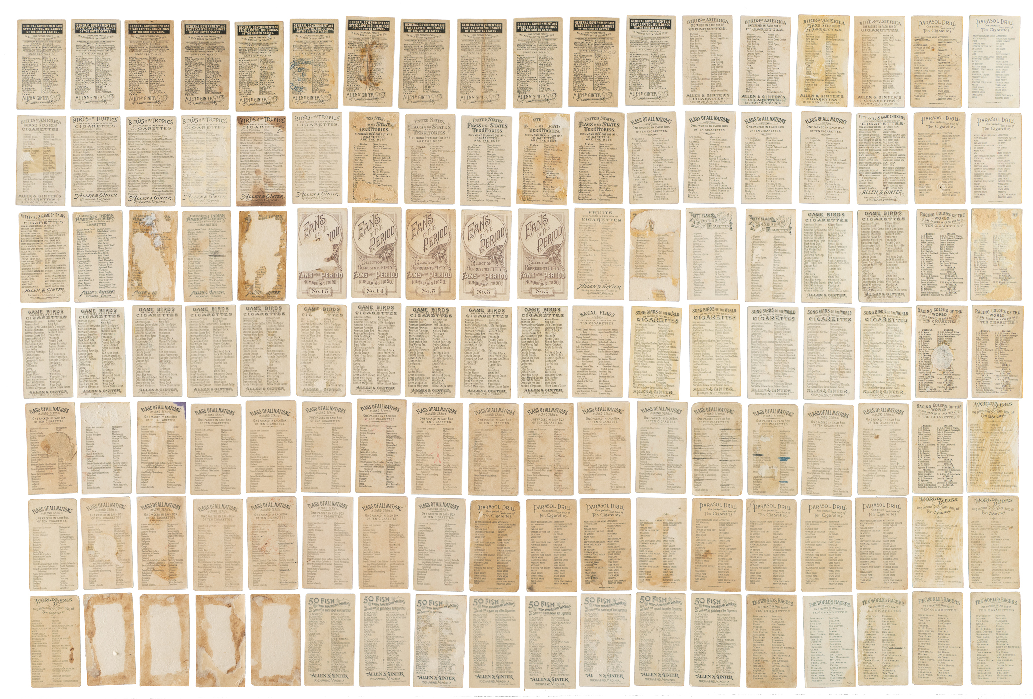 Presented is a very substantial collection of 218 tobacco cards from 26 different Allen & Ginter issues from between 1887 and 1890. Truly a collection unto itself, this assemblage of Allen & Ginter tobacco cards includes samples and groups from some of the 19th century's most popular nonsport card sets. While the cards in this collection span several grades, it is an extremely pleasing group overall. Condition is 35% Vg-Ex to Ex (including a few better), 25% Gd to Vg, and 40% Pr to Fr (including a few trimmed). Most of the lower-grade cards present in much better condition when viewed from the front but are downgraded due to flaws on the reverse, such as pencil notations, album residue, or paper loss, all extremely common flaws when dealing with 19th century cards. This collection consists of the following (all cards are different except for six noted duplicates):