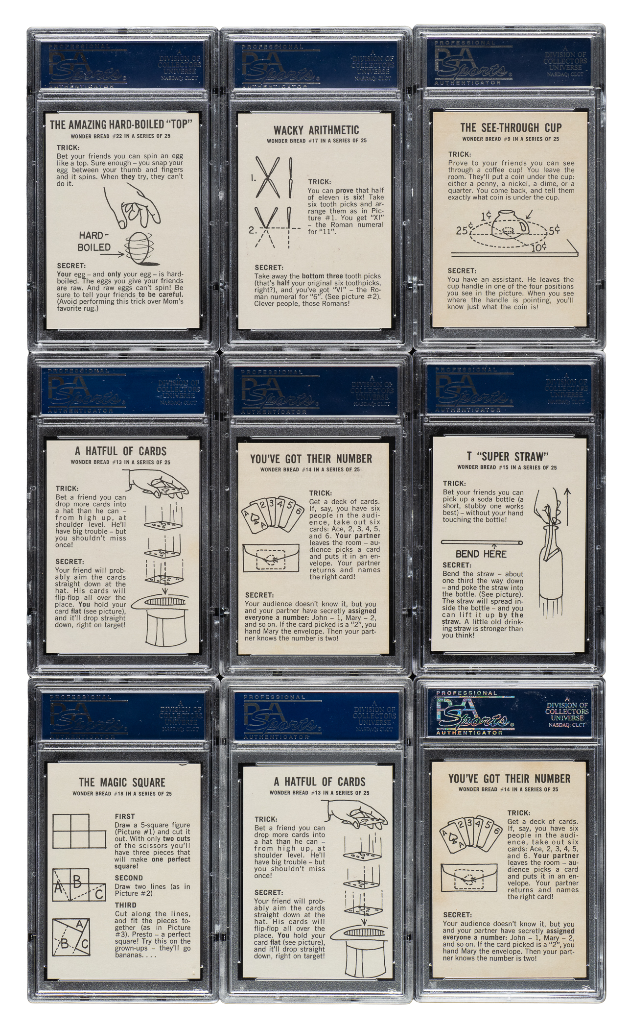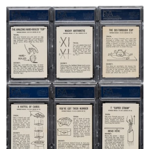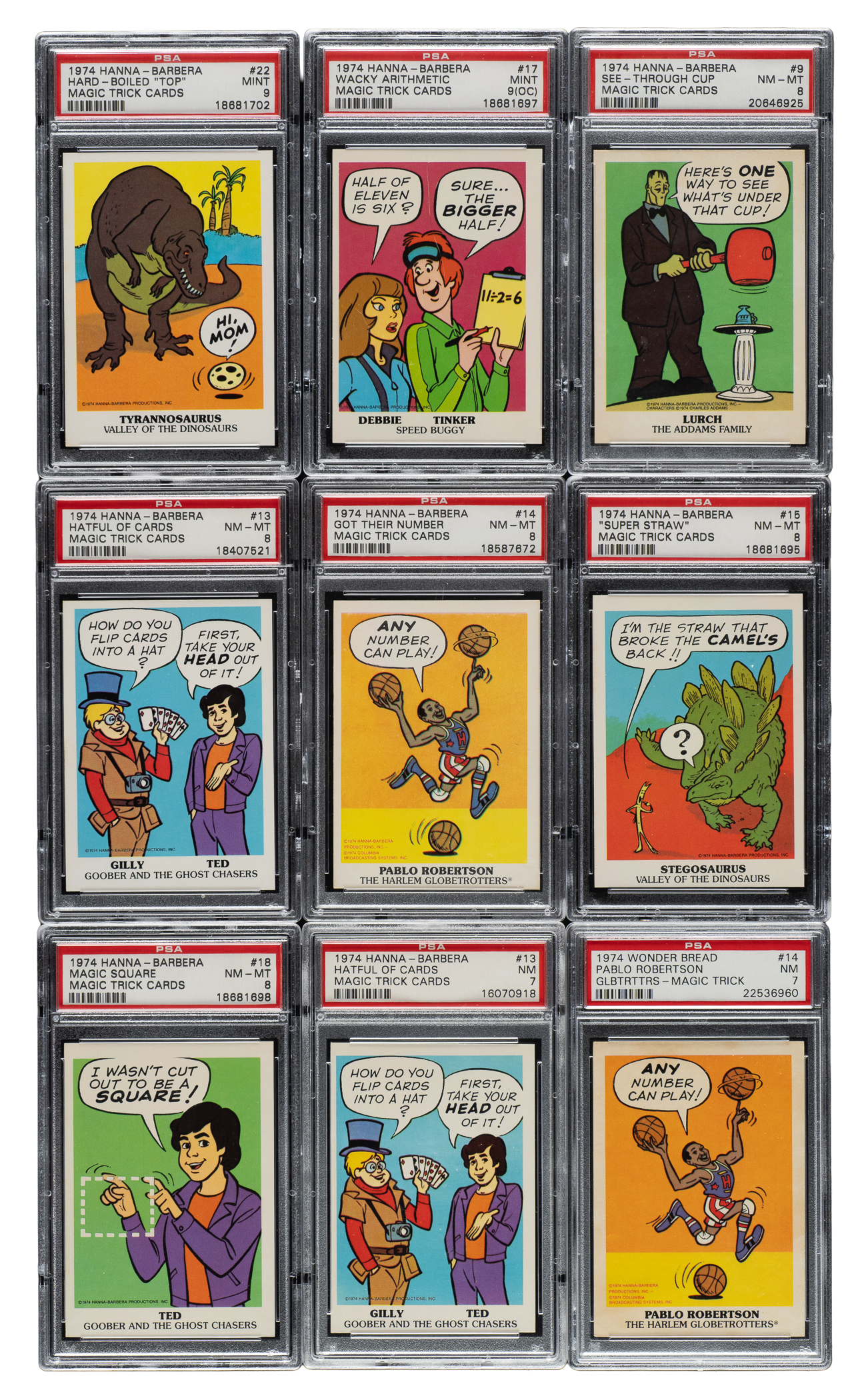 Collection of nine 1974 Hanna-Barbera Magic Trick cards, each graded and encapsulated by PSA. PSA Grading Composite: MINT 9 (2 cards): #17 (OC) and 22. NM-MT 8 (5 cards): #9, 13, 14, 15, and 18. NM 7 (2 cards): #13 and 14. Total: 9 cards.