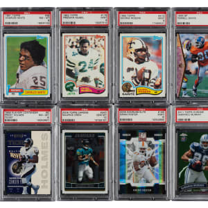 Collection of twelve 1981 to 2011 Topps, Topps Chrome, and Upper Deck football cards, each graded and encapsulated by PSA. This collection consists of the following: 1) 1981 Topps (1 card): #69 (NM-MT 8). 2) 1982 Topps (2 cards): #176 (MINT 9) and 410 (MINT 9). 3) 1988 Topps (1 card): #363 (GEM MINT 10). 4) 1995 Upper Deck SP (2 cards): #18 Martin/foil (MINT 9) and 130 Davis (MINT 9). 5) 1998 Playoff Contender Ticket (1 card): #5 (NM-MT 8). 6) 1999 Upper Deck SP Authentic (1 card): #91 (MINT 9). 7) 2006 Topps Chrome (1 card): #247 (GEM MINT 10). 8) 2009 Donruss Elite (1 card): #106 (#743/999, MINT 9). 9) 2009 Topps Chrome (1 card): #TC180 (MINT 9). 10) 2011 Topps Chrome (1 card): #173 (MINT 9). Total: 12 cards.