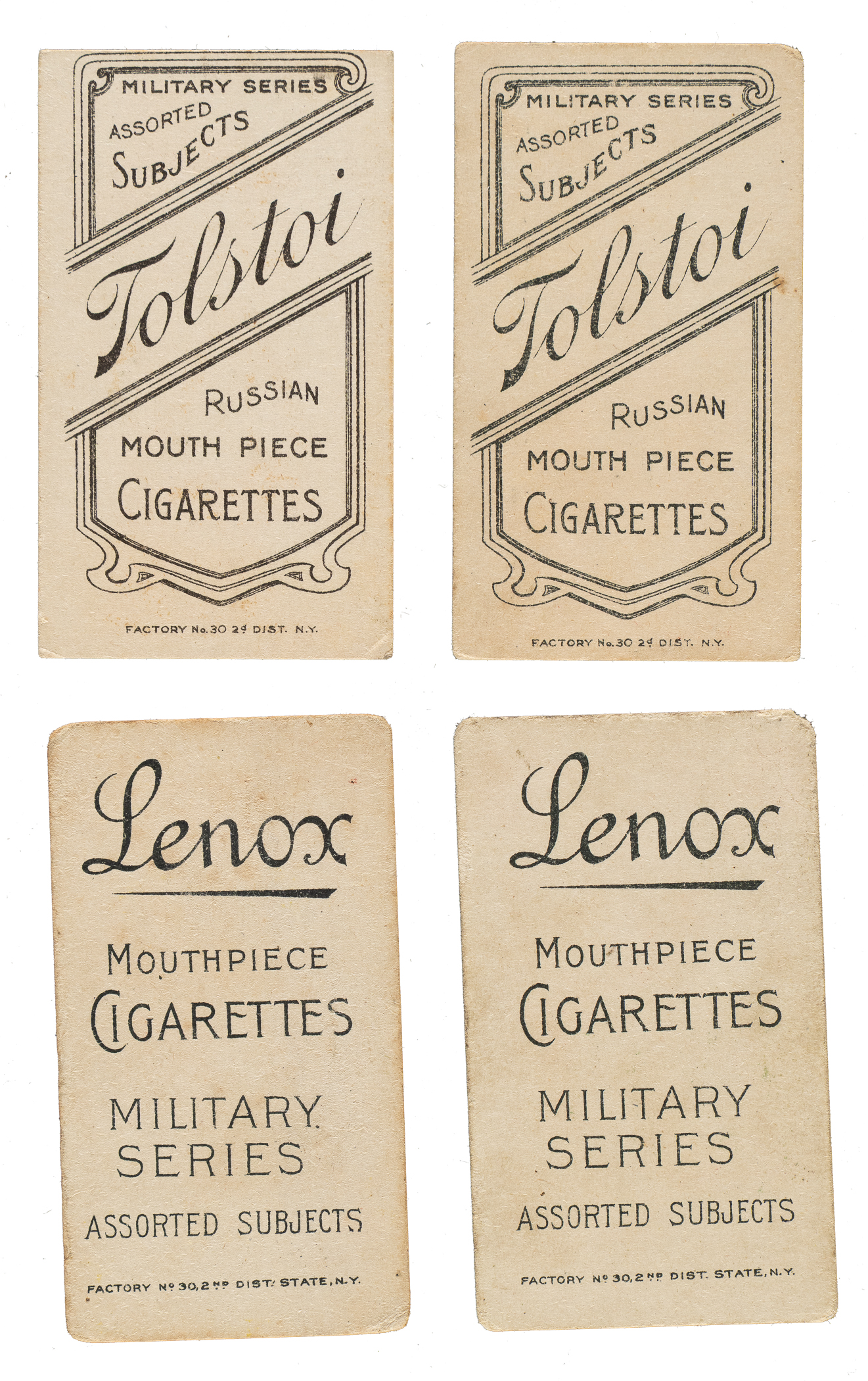 Presented is a near-complete set (49 out of 50) of T80 "Military Series," missing only "Scottish Rifles Piper England" for completion. Issued with five different tobacco brands between 1910 and 1911, each card features a beautifully rendered multi-color illustration of military men from around the world. This is an attractive set, presenting with bright colors and crisp images throughout. The condition of the set is 18% Vg-Ex, 61% Gd to Vg, and 21% Pr to Fr. A few cards are factory small. Included are two duplicates in Poor condition. Forty-eight of the fifty-one cards have a Tolstoi advertising reverse while the other three feature a rare Lenox reverse. This is a bright and attractive near-complete set (minus one) of this popular 1910-era nonsport issue. Total: 51 cards (near set of 49 plus two duplicates).