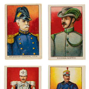 Presented is a near-complete set of T79 "Military Series" consisting of seventy-nine different cards (out of one hundred in the set). Included are twenty-one duplicates. Issued with three different tobacco brands circa 1910, each card features a beautifully rendered multi-color illustration of military men from seventeen countries around the world. Included are twenty-one duplicates. This near set consists primarily of Fez Cigarettes advertising backs (83), with the scarcer Tolstoi (12) and Lenox (5) brands comprising the balance. The condition of the near-complete set is 37% Vg-Ex to Ex (approximately two-thirds Vg-Ex), 47% Gd to Vg, and 16% Pr to Fr. Three cards have been professionally graded and encapsulated by PSA. Keys: Aide-De-Camp-Bulgaria (POOR 1), Officer of Field Artillery-Italy (FAIR 1.5), Rifelman, Austria (upside-down and off-center Tolstoi back, otherwise Ex+), and Royal Engineers-Private-Gr. Brit. (GOOD 2). Missing the following twenty-one cards for completion: Captain of Infantry-USA, Lieutenant of Infantry-USA/white, Private of Infantry-USA/facing forward, West Point Cadet-Officer-USA, General-Bulgaria, Officer of Mountain Artillery-France, Kings Royal Rifle Corps-Great Britain, Horse Artillery-Great Britain, Sharpshooter-Greece, Officer of Cuirassiers-Italy, Major of Cavalry-Japan, Army Surgeons-Prussia, Life Guards Hussars-Prussia, Major of Trumpeters-Prussia, General-Roumania, Private of Dragoon Reg’t-Russia, Private of Life-Guards Sharpshooters-Russia, Chasseur-Spain, Riding Master-Spain, Officer of Engineers-Sweden, and Sapper Zouave Guards-Turkey. Duplicates (21): Major-General-USA, Private of Infantry-USA/facing sideways, Officer of Dragoons-Austria, Rifleman-Austria, Cuirassier France, Officer of Foot Rifles-France, Private of Hanoverian Reg’t-Germany, Cavalry Private-Greece, two General-Italy, Private of Engineer Corps-Italy, Private Cavalry-Japan, Trumpeter-Japan, Red Hussar-Roumania, Don Cossack-Russia, two Officer of Chasseurs Life-Guards-Russia, Private-Sapper Battalion-Russia, Lieutenant-Spain/blue/red/white, Lieutenant-Infantry-Spain, and Private of Albanese Guards-Turkey. The condition of the duplicates is Gd to Vg, with four Vg-Ex and two lesser. This is a very attractive and mostly mid-grade near-complete set of this popular 1910-era nonsport issue, presenting with bright colors and crisp images throughout. Total: 100 cards (near set of 79 plus 21 duplicates).