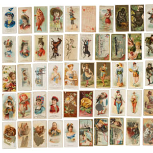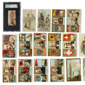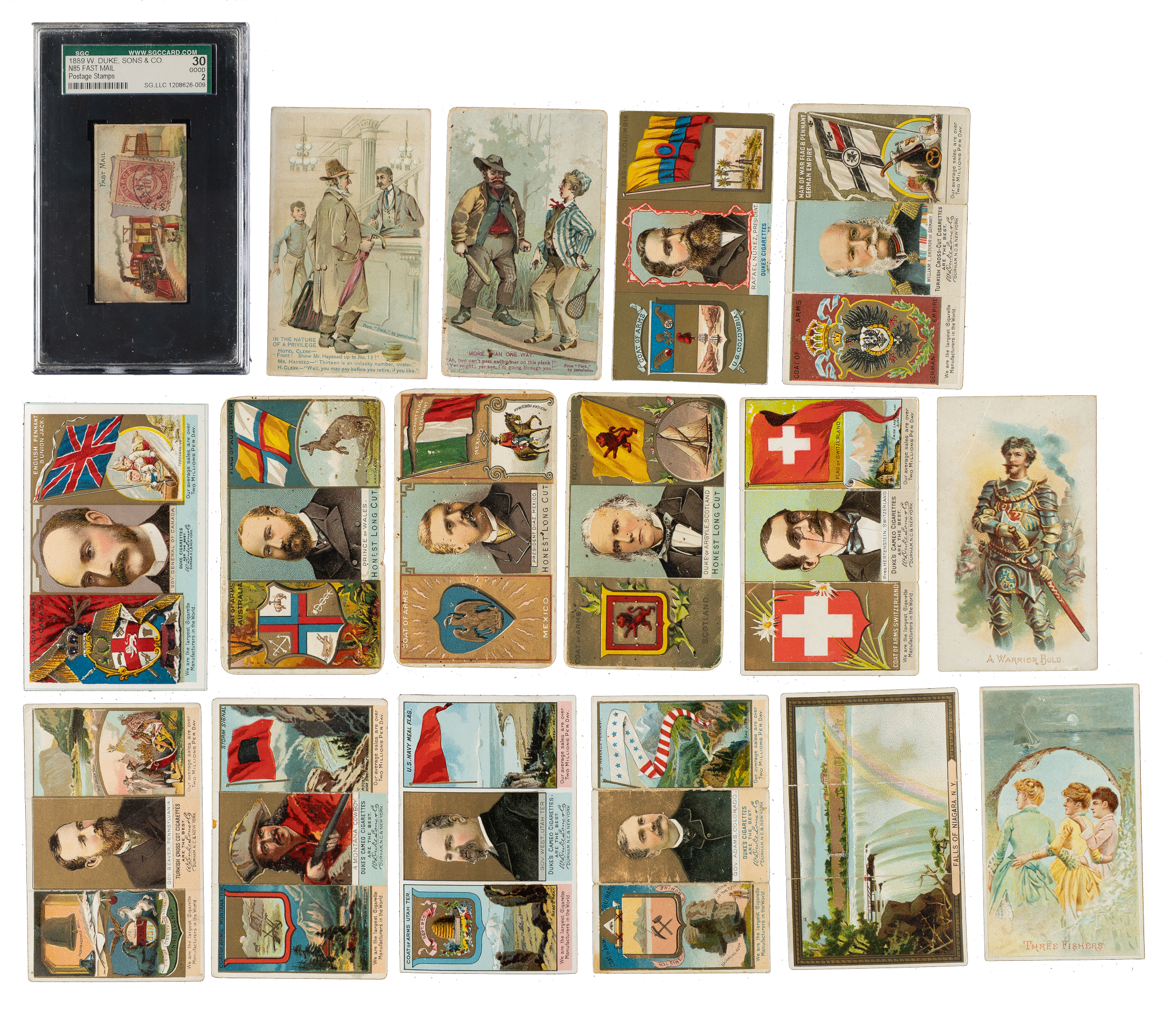 Collection of 281 nonsport tobacco-cards produced by Duke, Goodwin, Kimball, and Kinney between 1888 and 1892. A total of 38 different sets are represented by this collection. Overall condition ranges from Pr to Vg, averaging Gd (with some slightly better). This collection consists of the following: 1) N70-1 Duke "Actors and Actresses: Costumes of all Nations" Series 1 (17 cards). 2) N70-2 Duke "Actors and Actresses: Costumes of all Nations" Series 1 (2 cards). 3) N71-1 Duke "Actors and Actresses: Costumes of all Nations" Series 2 (14 cards). 4) N71-2 Duke "Actors and Actresses: Costumes of all Nations" Series 2 (2 cards). 5) N72 Duke "Coins of All Nations" (1 card). 6) N73-1 Duke "Fancy Dress Ball Costumes" Small (29 cards). 7) N73-2 Duke "Fancy Dress Ball Costumes" Small (1 card). 8) N74 Duke "Fishers and Fish" (6 cards): One card with severe paper loss on reverse. 9) N75 Duke "Floral Beauties: Language of Flowers" (2 cards). 10) N80 Duke "Holidays" (1 card). 11) N81 Duke "Jokes" Small (4 cards). 12) N82 Duke "Musical Instruments" (10 cards). 13) N83 Duke "Ocean and River Steamers" (18 cards). 14) N85 Duke "Postage Stamps" (1 card): Fast Mail (SGC GOOD 30). 15) N86 Duke "Scenes of Perilous Occupations" (11 cards). 16) N87 Duke "Shadows" (18 cards): One skinned. One blank front. 17) N88 Duke "The Terrors of America" Small (4 cards). Two skinned (including one trimmed). "Football. Oh My Shin." split in two. 18) N91 Duke "Yacht Colors of the World" Small (13 cards): One card with severe paper loss on reverse. 19) N116 Duke "Illustrated Songs" (4 cards). 20) N126-A Duke "Rulers, Flags, Arms of All Nations: Cards" (7 cards). Two skinned, other five with severe paper loss on reverse. 21) N126-B Duke "Rulers, Flags, Arms of All Nations: Triple Folders" (8 cards) Plus Two Panels: All eight cards are still attached. Also includes two detached single panels (Arizona and Bavaria). 22) N128 Duke "Snapshots from Puck" (2 cards). 23) N164 Goodwin "Flowers" (10 cards). 24) N182 Kimball "Ballet Queens" (9 cards). 25) N185 Kimball "Dancing Girls of the World" (4 cards). 26) N186 Kimball "Dancing Women" (14 cards). 27) N187 Kimball "Fancy Bathers" (9 cards). 28) N216 Kinney "Animals" (13 cards). 29) N222 Kinney "Leaders" (3 cards). 30) N225 Kinney "National Dances" (2 cards). 31) N226 Kinney "Naval Vessels of the World" (4 cards): One card with severe paper loss on reverse. 32) N228-2 Kinney "Novelties" Border (7 cards). 33) N228-3 Kinney "Novelties" Die-cut (2 cards). 34) N229 Kinney "Famous Running Horses" American (2 cards). 35) N231 Kinney "Great American Trotters" (9 cards). 36) N232 Kinney "Surf Beauties" (14 cards). 37) N233 Kinney "Transparent Playing Cards" (1 card). 38) N240 Kinney "Types of Nationalities: Folding Cards" (1 card): The top half of the suited man is missing, bottom half is detached from smoking man and fisher girl. This is a very presentable collection of cards from these popular sets. Total: 281 cards.