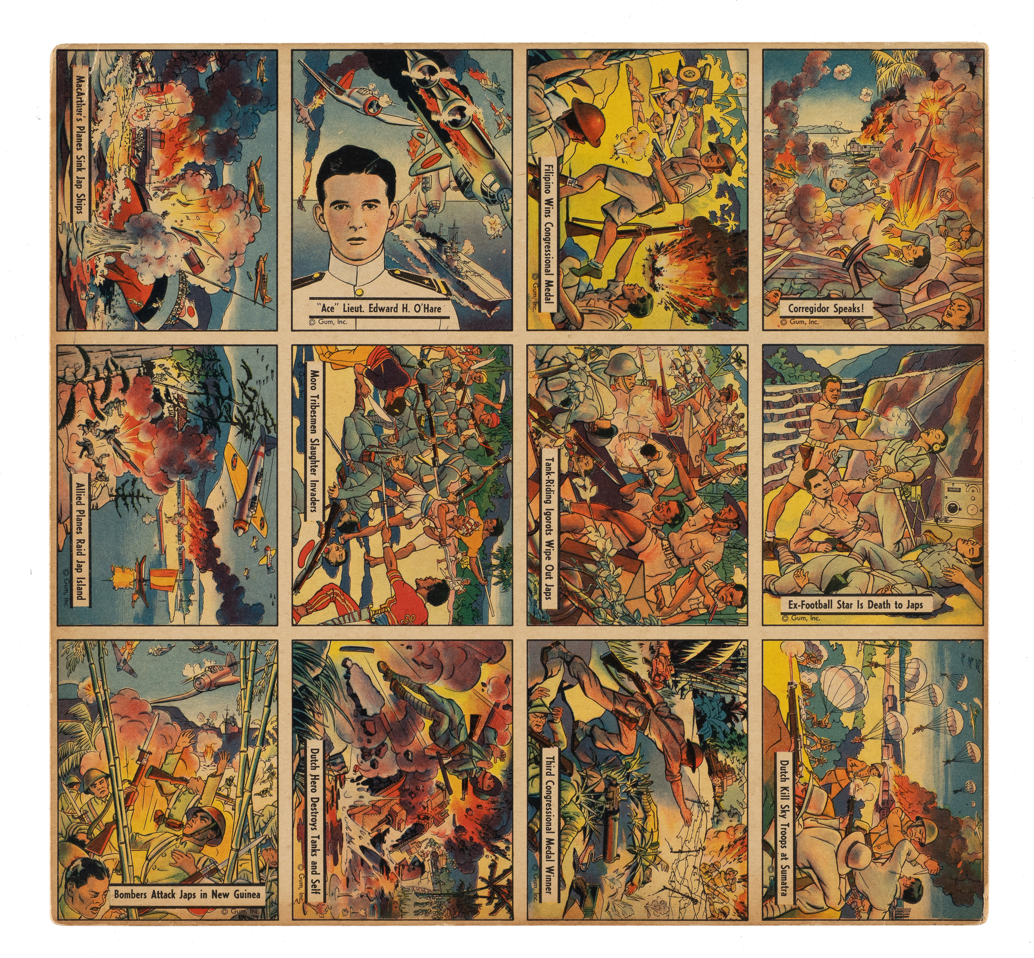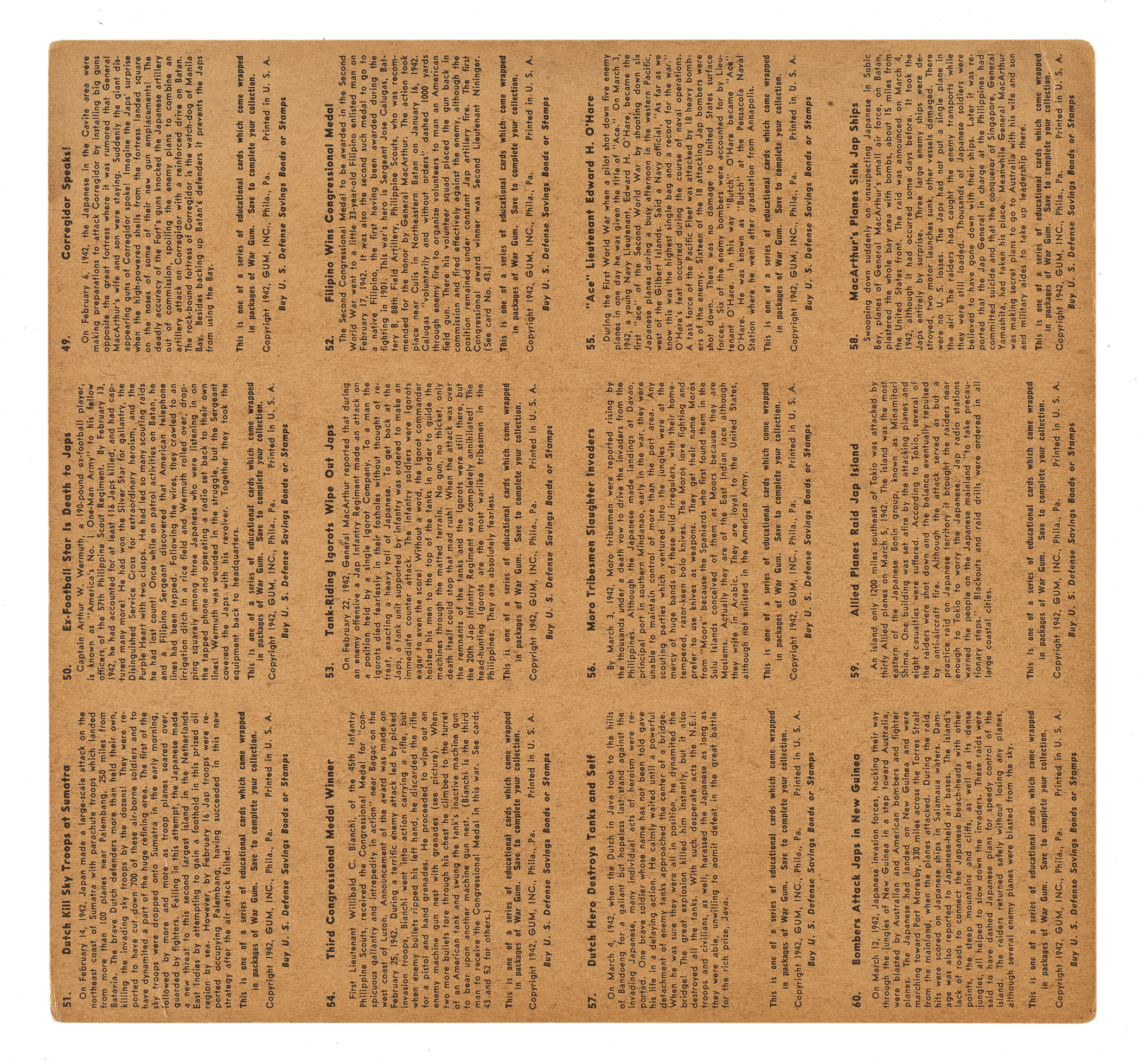 12-card uncut sheet of R164 Gum, Inc., "War Gum." These cards, issued by Gum, Inc., in 1941 through 1942, feature military men in various scenes of battle during the Second World War. Their outstanding color, detailed artwork, historically significant subject matter, and the exciting narratives presented on the backs all contribute to making this set one of nonsport collecting's all-time classics. Featuring cards #49-60, this sheet (9-38 x 10 inches) displays some light creasing, moderate corner wear, and toning front and back. In Good to Very Good condition overall.
