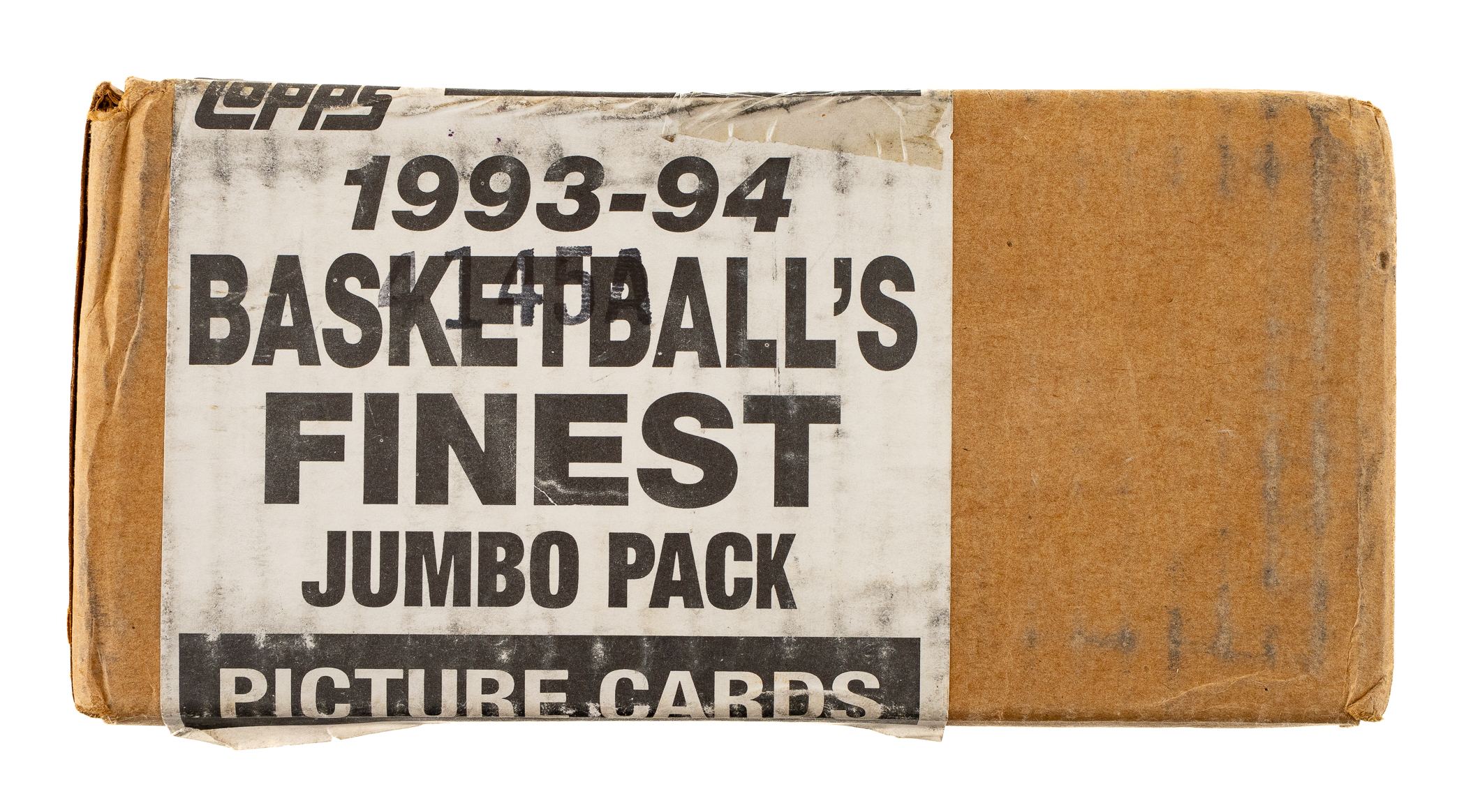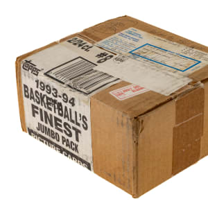 Unopened jumbo case of 1993-1994 Topps Finest basketball, featuring two unopened boxes. Each box contains 24 packs for a total of 48 packs. The set is highlighted by Michael Jordan and the rookie cards of Anfernee Hardaway and Chris Webber. The lone insert cards in this series, Main Attractions, are exclusive to jumbo packs. The case comes factory-sealed by Topps and displays light shelf wear. The size/weight of this item requires that there will be an additional shipping charge for this lot.