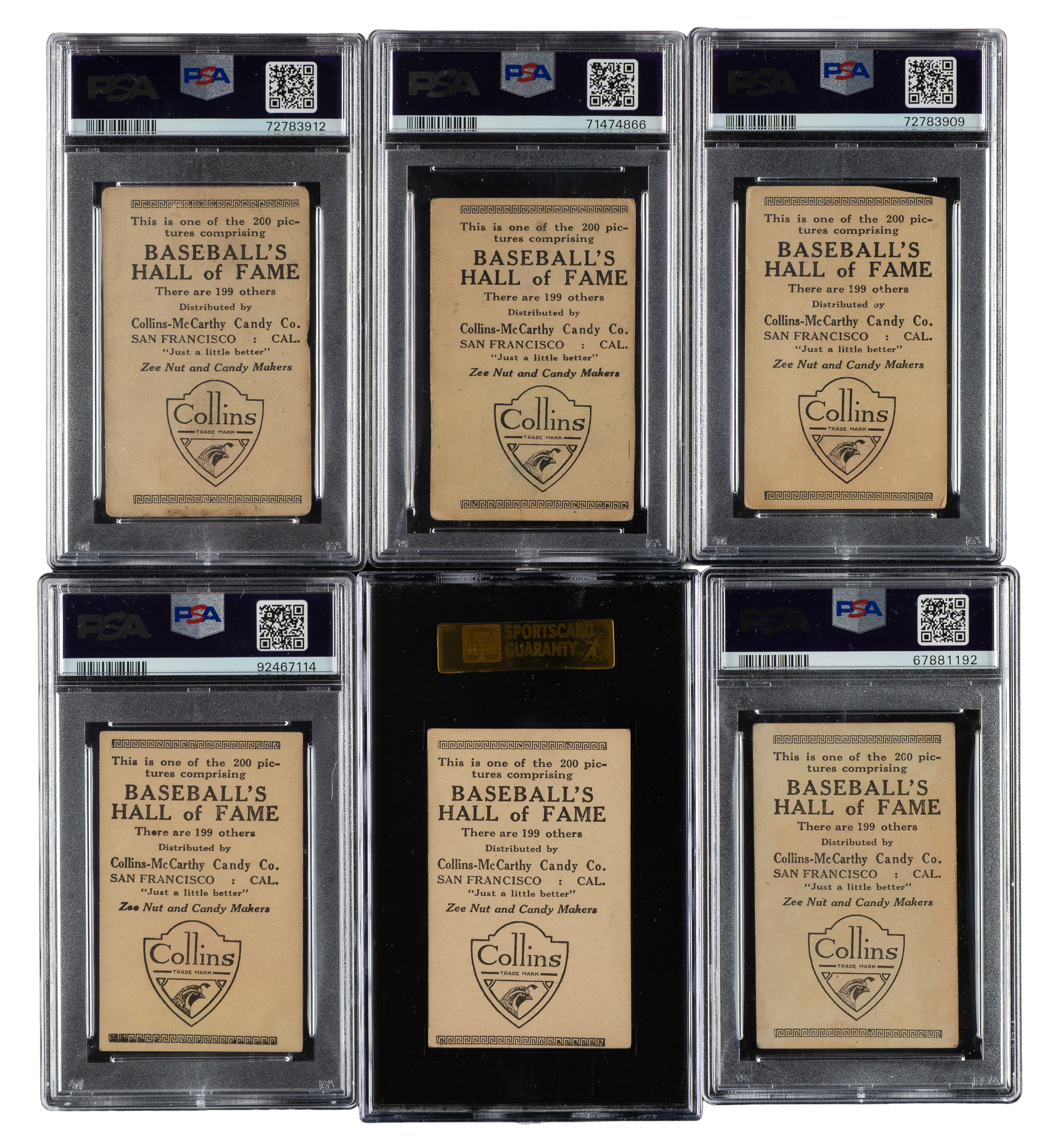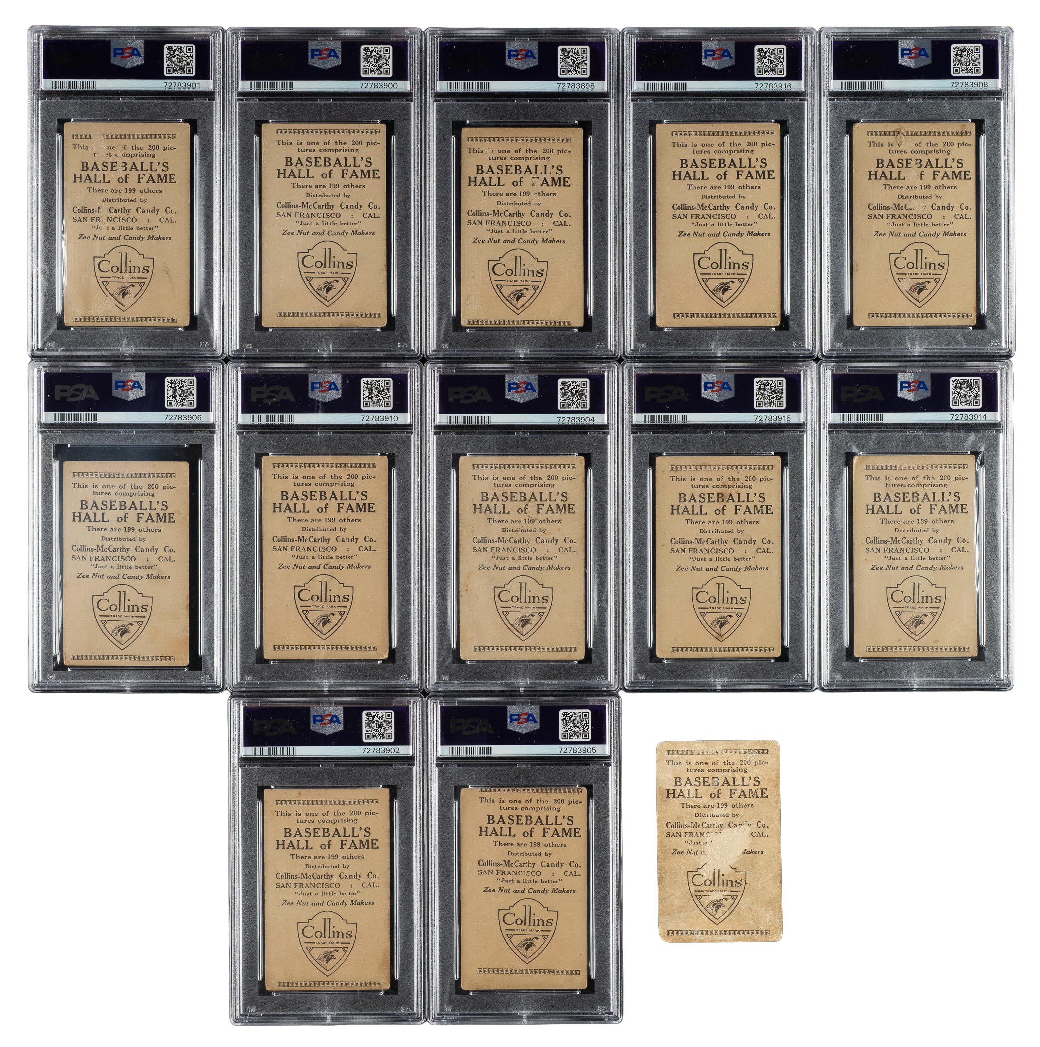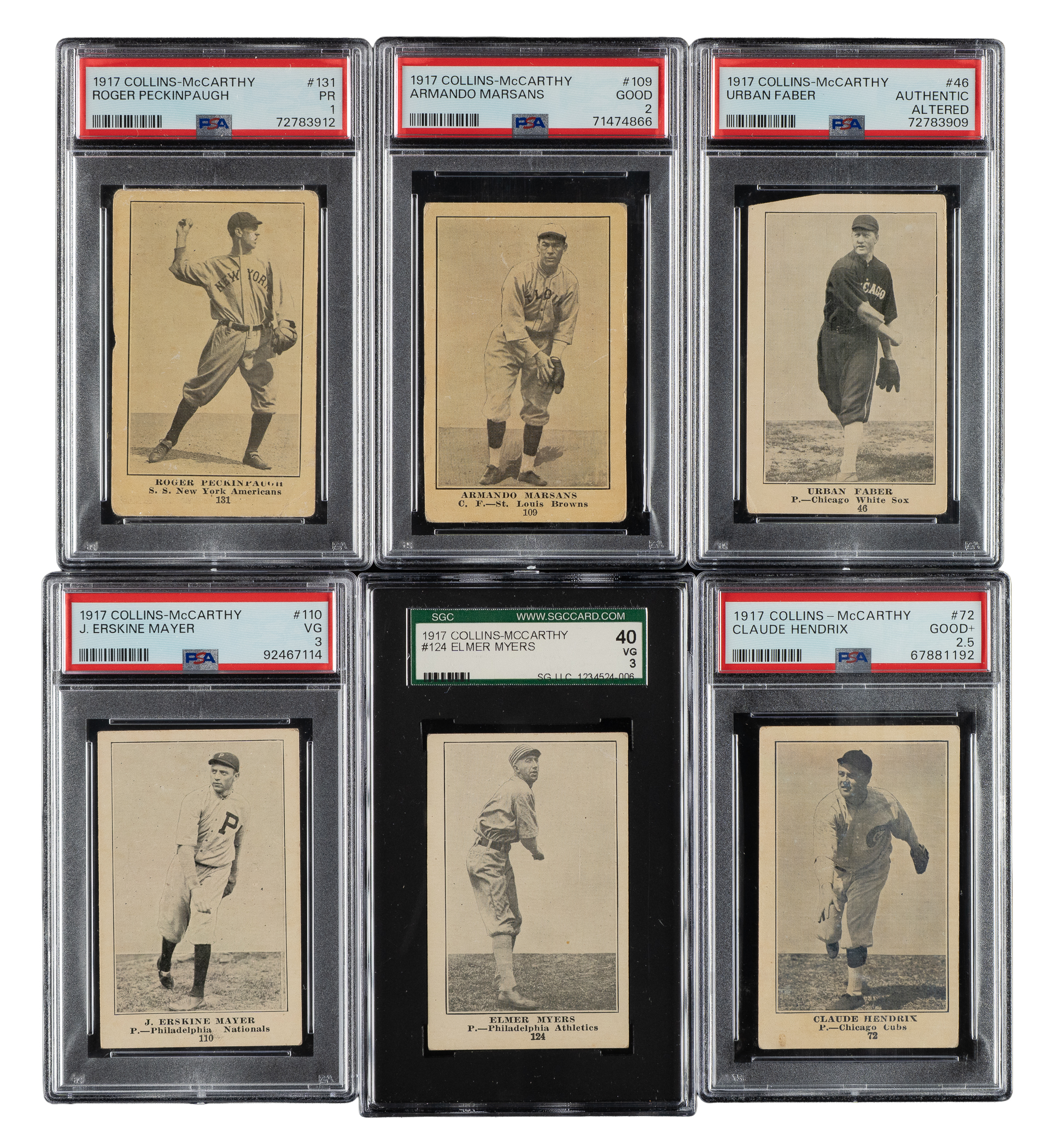 Presented is a rarely offered partial set of 104 different cards (of the 200 in the set) from the E135 Collins-McCarthy series, highlighted by Hall of Famers Dave Bancroft and Urban Faber. Issued in 1917 by the Collins-McCarthy Candy Co. of San Francisco, the 200-card black-and-white E135 set was the company's only venture into issuing cards of Major Leaguers. Unlike the somewhat similar 1916 M101-4/5 Sporting News set, these cards were never issued as complete sets to the public, and so are naturally much rarer. They were also larger than M101-4/5 cards. The E135 set was produced on a slightly thinner stock that is far more susceptible to wear and has a very glossy surface, which is very prone to creasing. The set is commonly referred to as issued by Collins-McCarthy, but, as most collectors know, several different companies actually issued the set. Cards were printed with advertising for regional issuers as well. All of the cards in this collection have Collins-McCarthy backs. Condition of the set is 14% Vg or slightly better, 41% Gd, and 45% Pr to Fr. Eighteen cards have been professionally graded and encapsulated by PSA (one is SGC). Keys: #5 (GOOD 2), 7 (GOOD 2), 12 Bancroft (Pr), 13 (FAIR 1.5), 46 Faber (PSA Authentic/Altered), 57 (POOR 1), 69 (FAIR 1.5), 72 Hendrix (GOOD+ 2.5), 75 (POOR 1 [MC]), 88 (GOOD 2), 97 (POOR 1), 103 (POOR 1), 104 (FAIR 1.5), 109 Marsans (GOOD 2), 110 Mayer (VG 3), 116 (POOR 1), 124 Myers (SGC VG 40), 131 Peckinpaugh (POOR 1), and 199 (FAIR 1.5). Missing the following 96 cards for completion: #2 Alexander, 4, 8, 9, 10, 11 Baker, 15, 16, 17, 18, 19, 22, 24, 25 Carey, 26, 27, 28 Cicotte, 29, 30 Cobb, 31 Collins, 34, 36 Crawford, 39, 42, 43, 44, 45 Evers, 47 Felsch, 50, 51, 52, 53, 55 Gandil, 60, 61, 63, 66, 71 Heilmann, 76, 77, 79 Hooper, 80 Hornsby, 81, 82 Jackson, 86 Jennings, 87 Johnson, 92, 93, 94, 100, 101, 102, 105, 107 Maranville, 108 Marquard, 113 McGraw, 114, 115, 117, 118, 120, 121, 125, 126, 127, 132, 136, 137 Rice, 139 Rixey, 142 Roush, 146, 147 Ruth, 148, 149, 150 Schalk, 153, 160, 162 Sisler, 166 Speaker, 168 Stengel, 171, 172, 173, 177, 178, 179, 180 Wagner, 182, 183, 185 Weaver, 187 Wheat, 190 Williams, 194, 195, 197, and 200. It is very rare to find this legendary issue offered as a partial set, or even as a significant collection. This is a remarkable offering and a very presentable partial set that presents better than suggested by its modest technical grades. Total: 104 cards. The size/weight of this item requires that there will be an additional shipping charge for this lot.
