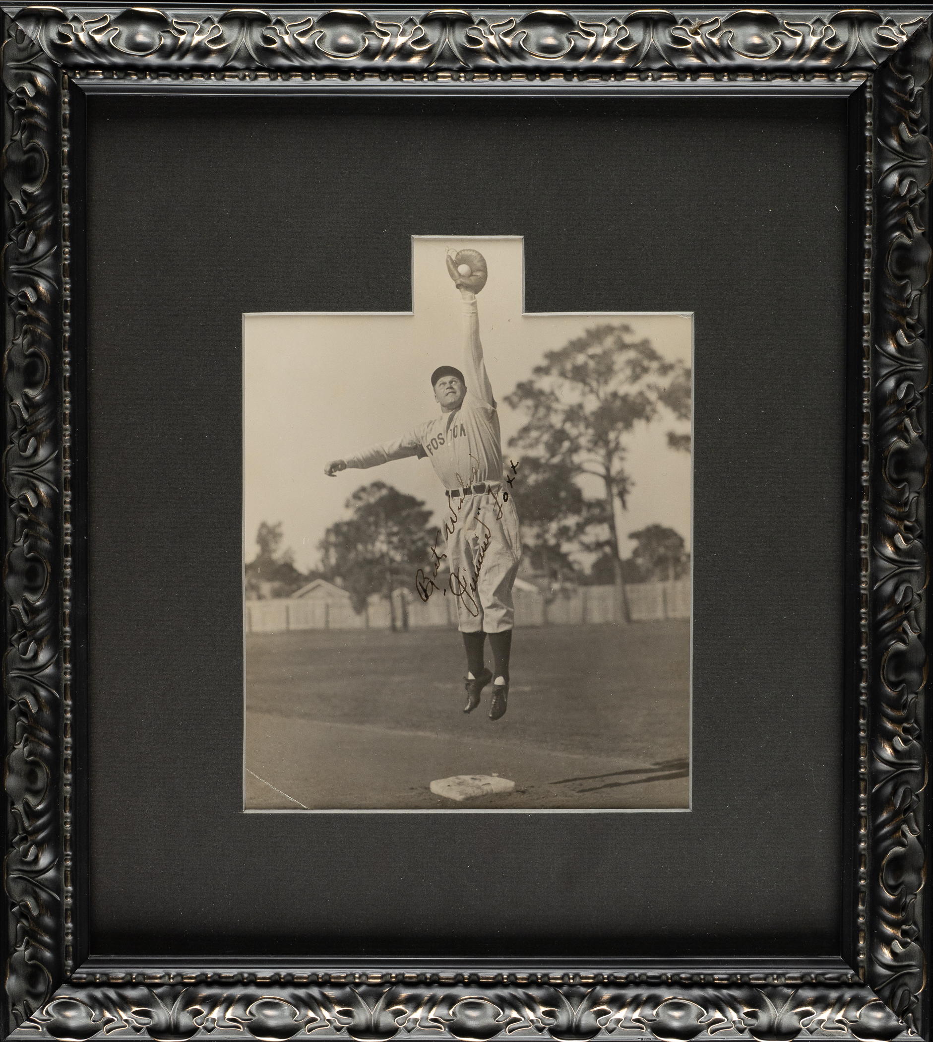 Original photo of Hall of Fame first baseman Jimmie Foxx as a member of the Boston Red Sox, signed by him on the front. Foxx has inscribed the photo "Best Wishes, Jimmie Foxx" in black ink. Foxx is captured leaping with his glove fully extended, snaring a high throw or a sharp line drive at first base. Accompanied by a Full LOA from PSA/DNA, which has certified the photo as a Type I example and deemed the signature "Authentic." Per PSA/DNA, the photo measures 8 x 10 inches and is in apparent Good condition (please note that the letter shows the picture before it was framed. The top-right corner is chipped). Matted and framed to total dimensions of 15 x 17 inches. The size/weight of this item requires that there will be an additional shipping charge for this lot.