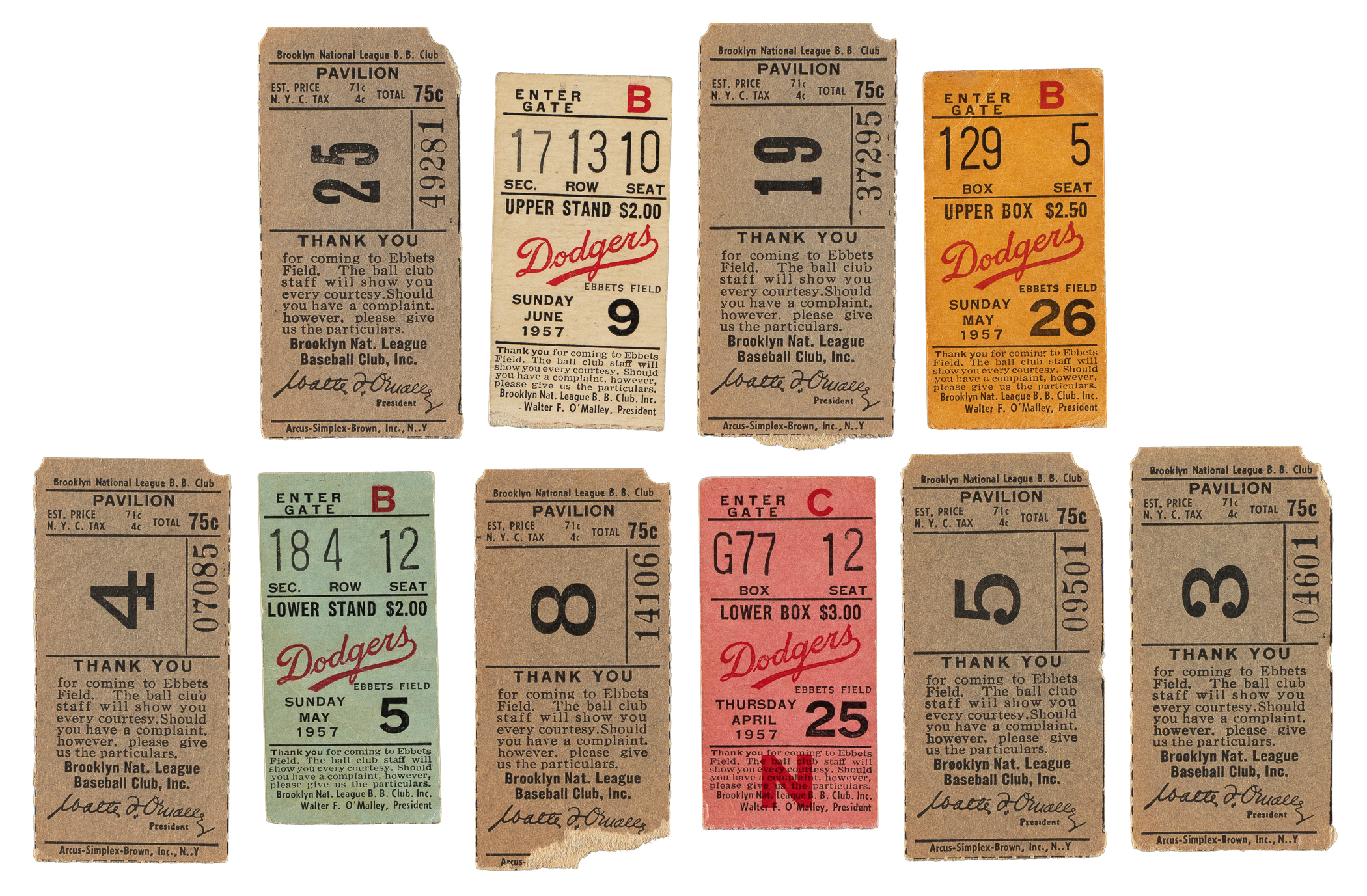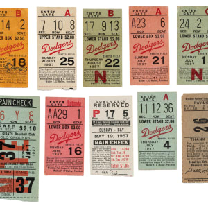Collection of twenty regular-season ticket stubs from the 1957 Brooklyn Dodgers season. 1957 would mark the Dodgers final season in Brooklyn. Ten tickets are noteworthy as each represents a career home run for a key Hall of Famer (Aaron, Campanella, Snider, and Musial). All but seven tickets have the date printed on the front, which is provided in the composite below. This collection consists of the following home games: April 20 vs. Pirates, April 21 vs. Pirates, April 24 vs. Giants, April 25 vs. Giants (rained out played August 5th), May 2 vs. Cardinals, May 5 vs. Braves, May 19 vs. Cardinals, May 26 vs. Giants, June 7 vs. Reds, June 9 vs. Reds, June 14 vs. Cardinals, June 15 vs. Cardinals, June 16 vs. Cardinals, July 1 vs. Giants, July 4 vs. Pirates, July 15 vs. Braves, July 21 vs. Cubs, August 18 vs. Pirates, August 22 vs. Braves, and August 25 vs. Cardinals. The tickets, which vary in size, range from Poor to Very Good (with a couple better). Total: 20 ticket stubs.