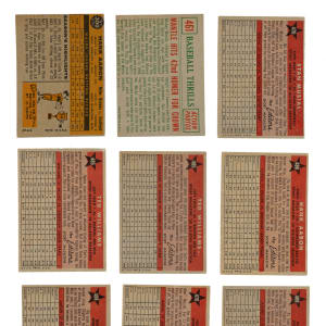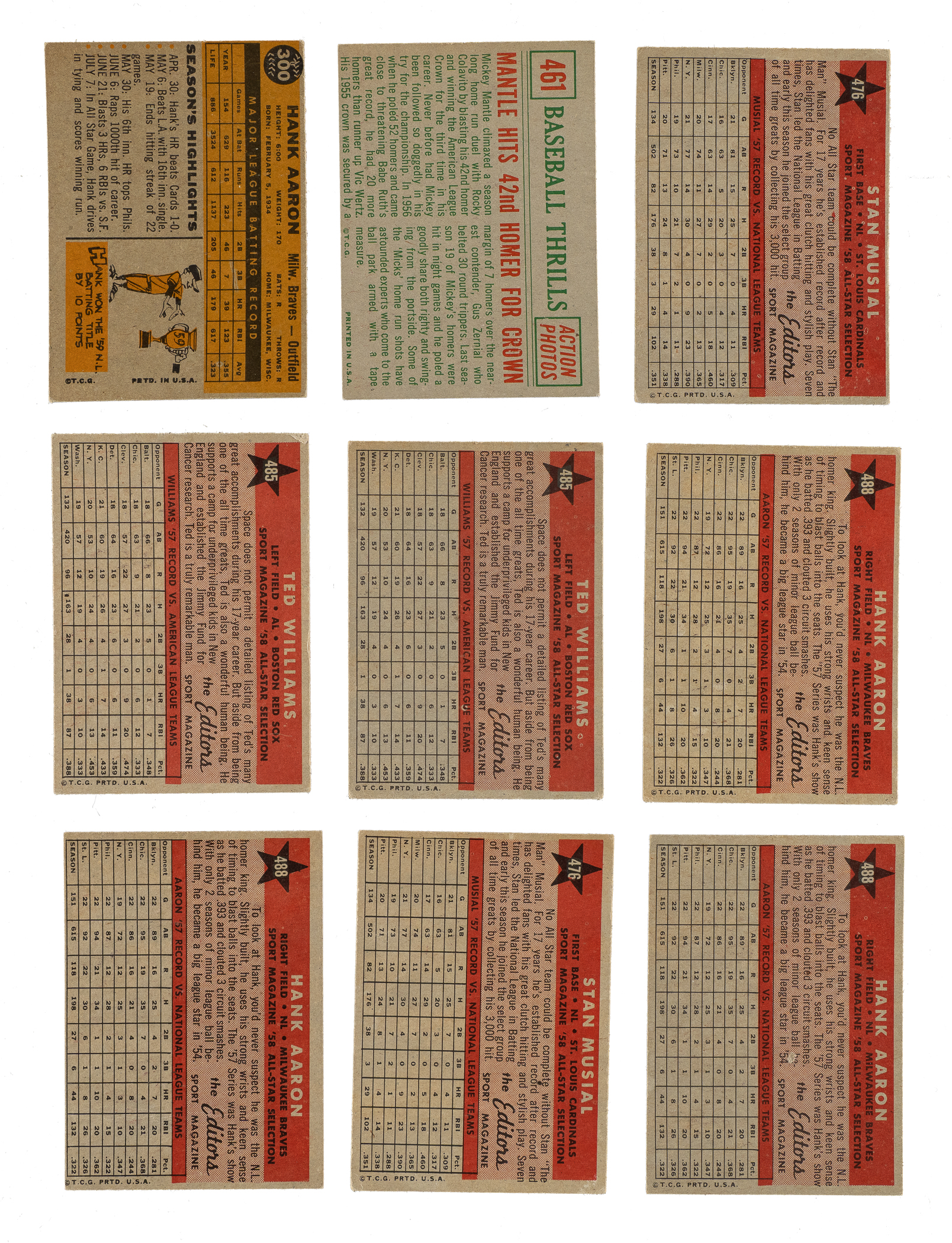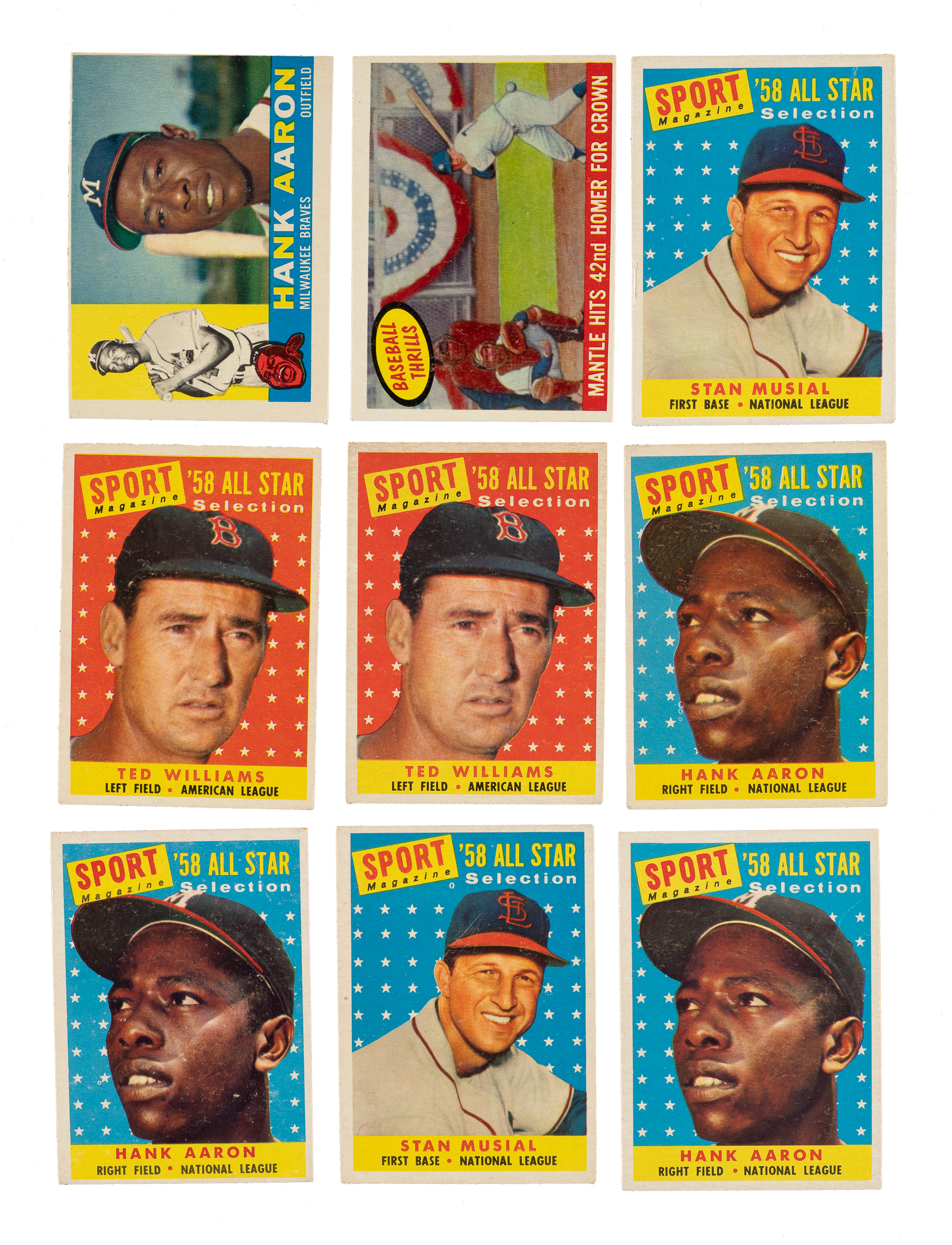 Collection of nine 1958 to 1960 Topps Hall of Fame cards, highlighted by Ted Williams, Hank Aaron, Stan Musial, and Mickey Mantle. This collection consists of the following: 1) 1958 Topps (7 cards): Two #476 Musial AS (both Vg), two 485 Williams AS (Vg-Ex and Vg), and three Aaron AS (Vg-Ex, Vg, and Gd+). 2) 1959 Topps (1 card): #461 Mantle Hits 42nd HR (Ex). 3) 1960 Topps (1 card): #300 Aaron (100/0 L/R and 10/90 T/B, otherwise Vg-Ex). Total: 9 cards.
