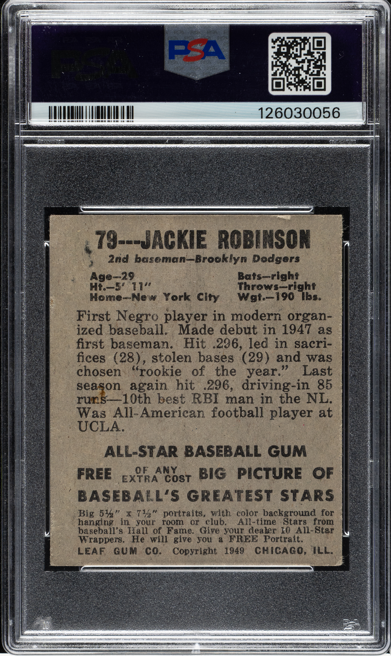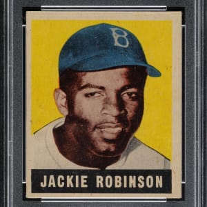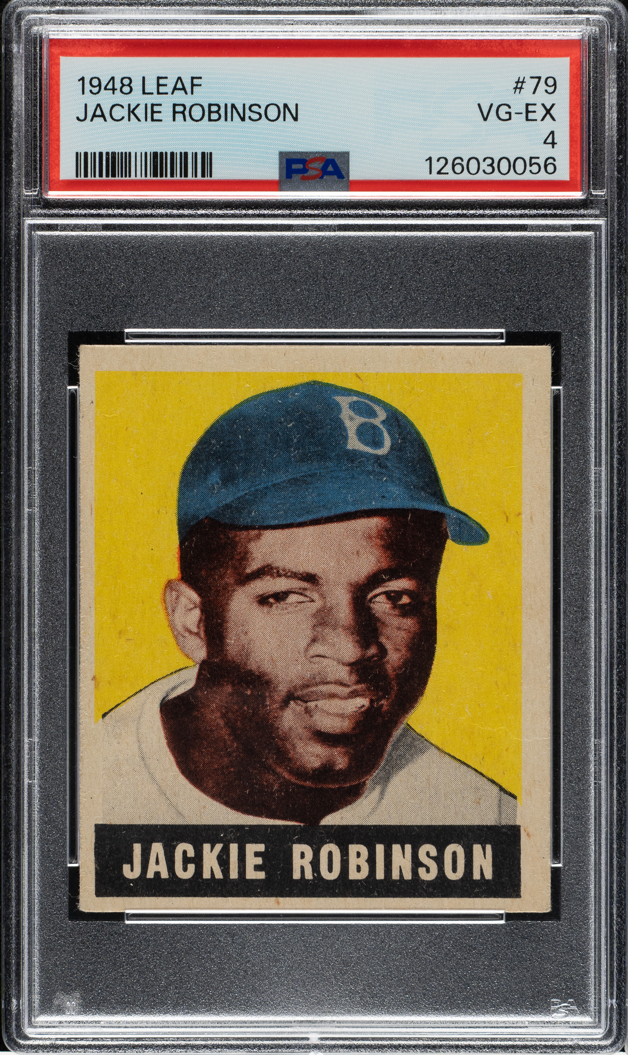 Graded VG-EX 4 by PSA. Mid-grade example of this classic rookie card featuring Brooklyn Dodgers Hall of Famer Jackie Robinson. The 1948-1949 Leaf card of Robinson is one of the most popular, striking, and classic of all his cards. The offered example has bold colors, outstanding registration, and light corner wear. There is an unobtrusive crease directly above Jackie's left shoulder. This is a solid example of one of the icons of postwar Hall of Fame card collecting.