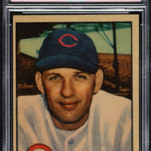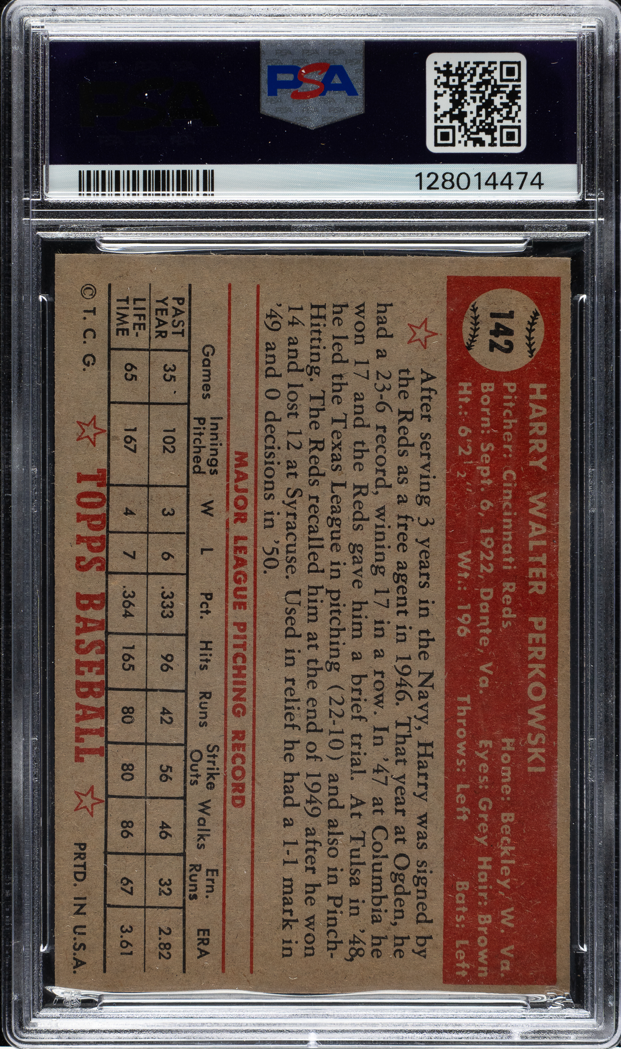 Graded EX-MT 6 by PSA. Only two examples graded higher (both are PSA-qualified). Attractive high-grade example of #142 Harry Perkowski (Cincinnati Reds) from the 1952 Topps "Canadian" gray-back series. Cards #131-190 within the 407-card 1952 Topps set are most commonly found printed on cream-colored stock. A small percentage of cards have been found printed on gray-colored stock. The Standard Catalog of Baseball Cards presents a theory that these cards have come to be known as Canadian-issued because the same phenomenon exists with 1954 Topps and an abbreviated set printed on gray stock designed for issue solely in Canada that year. Some collectors feel that this is a misnomer, instead theorizing that Topps produced a run of cards in this manner for one of two likely reasons. One is as simple as a temporary shortage of regular cream-colored stock in the factory during production. The other focuses on the slight differences in the card fronts, which as the Standard Catalog notes are "subjectively darker or more muted than the 'U.S.A.' versions." Some collectors believe that these cards were designed as part of a distribution arrangement with Kleenex and Doeskin tissues in which cards were inserted with packages of tissues. While no concrete evidence of this relationship has been unearthed, it is known that the "Rails and Sails" nonsport issue produced by Topps in 1955 was issued along with Doeskin tissues at the time. The late Bob Lemke, former editor of the Standard Catalog, presents a detailed analysis of these variations on his blog, which includes input from several longtime collectors and hobby researchers. Whatever the explanation for these cards, it is without dispute that they are extremely rare and even a single example can be hard to find! Bright, crisp, and clean, both front and back, with light corner wear, bold colors, and centering towards the bottom left. An attractive high-grade example that will be of great interest to 1952 Topps master-set collectors as well as advanced Topps-card enthusiasts.