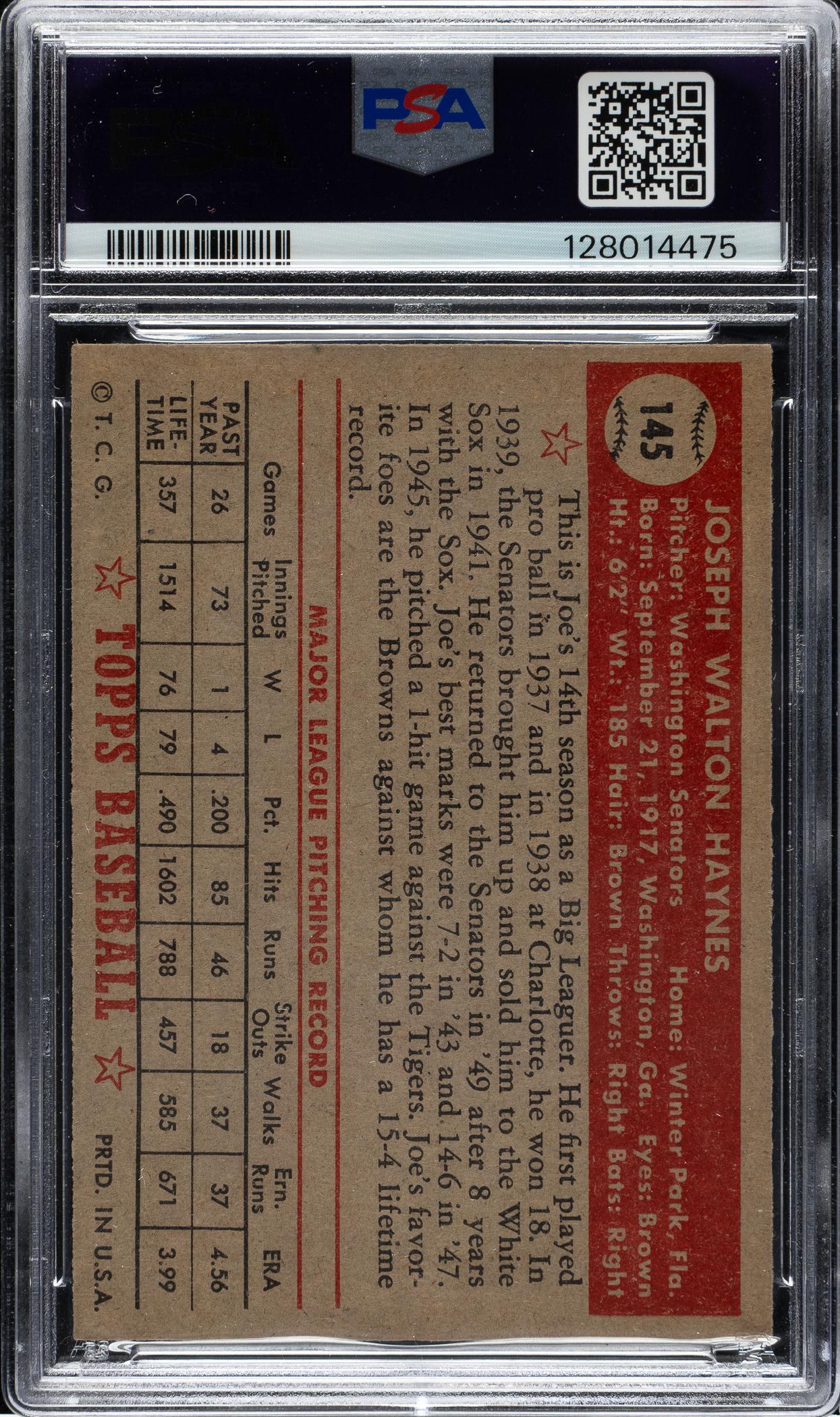 Graded EX-MT 6 by PSA. Only two examples graded higher. Attractive high-grade example of #145 Joe Haynes (Washington Senators) from the 1952 Topps "Canadian" gray-back series. Cards #131-190 within the 407-card 1952 Topps set are most commonly found printed on cream-colored stock. A small percentage of cards have been found printed on gray-colored stock. The Standard Catalog of Baseball Cards presents a theory that these cards have come to be known as Canadian issued because the same phenomenon exists with 1954 Topps and an abbreviated set printed on gray stock designed for issue solely in Canada that year. Some collectors feel that this is a misnomer, instead theorizing that Topps produced a run of cards in this manner for one of two reasons. One is as simple as a temporary shortage of regular cream-colored stock in the factory during production. The other focuses on the slight differences in the card fronts, which as the Standard Catalog notes are "subjectively darker or more muted than the 'U.S.A.' versions." Some collectors believe that these cards were designed as part of a distribution arrangement with Kleenex and Doeskin tissues in which cards were inserted with packages of tissues. While no concrete evidence of this relationship has been unearthed, it is known that the "Rails and Sails" nonsport issue produced by Topps in 1955 was issued along with Doeskin tissues at the time. The late Bob Lemke, former editor of the Standard Catalog, presents a detailed analysis of these variations on his blog (http://boblemke.blogspot.com/2011/05/1952-topps-not-canadian.html), which includes input from several longtime collectors and hobby researchers. Whatever the explanation for these cards, it is without dispute that they are extremely rare and even a single example can be hard to find! Bright, crisp, and clean, both front and back, with strong corners, bold colors, and centering towards the bottom right. An attractive high-grade example that will be of great interest to 1952 Topps master-set collectors as well as advanced Topps-card enthusiasts.
