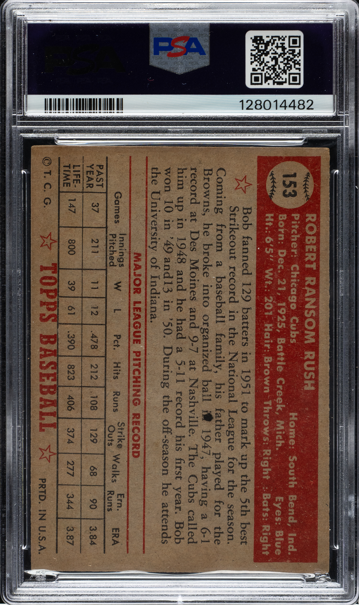 Graded EX-MT 6 by PSA. Only one example graded higher (NM-MT 8 [MC]). Attractive high-grade example of #153 Bob Rush (Chicago Cubs) from the 1952 Topps "Canadian" gray-back series. Cards #131-190 within the 407-card 1952 Topps set are most commonly found printed on cream-colored stock. A small percentage of cards have been found printed on gray-colored stock. The Standard Catalog of Baseball Cards presents a theory that these cards have come to be known as Canadian issues because the same phenomenon exists with 1954 Topps and an abbreviated set printed on gray stock designed for issue solely in Canada that year. Some collectors feel that this is a misnomer, instead theorizing that Topps produced a run of cards in this manner for a specific reason. One theory is simple: There may have been a temporary shortage of regular cream-colored stock in the factory during production. The other theory focuses on the slight differences in the card fronts, which as the Standard Catalog notes are "subjectively darker or more muted than the 'U.S.A.' versions." Some collectors believe that these cards were designed as part of a distribution arrangement with Kleenex and Doeskin tissues in which cards were inserted with packages of tissues. While no concrete evidence of this relationship has been unearthed, it is known that the "Rails and Sails" nonsport issue produced by Topps in 1955 was issued along with Doeskin tissues at the time. The late Bob Lemke, former editor of the Standard Catalog, presents a detailed analysis of these variations on his blog, which includes input from several longtime collectors and hobby researchers. Whatever the explanation for these cards, it is without dispute that they are extremely rare and even a single example can be hard to find! Bright, crisp, and clean, both front and back, with light corner wear, bold colors, and centering towards the bottom left. An attractive high-grade example that will be of great interest to 1952 Topps master-set collectors as well as advanced Topps-card enthusiasts.