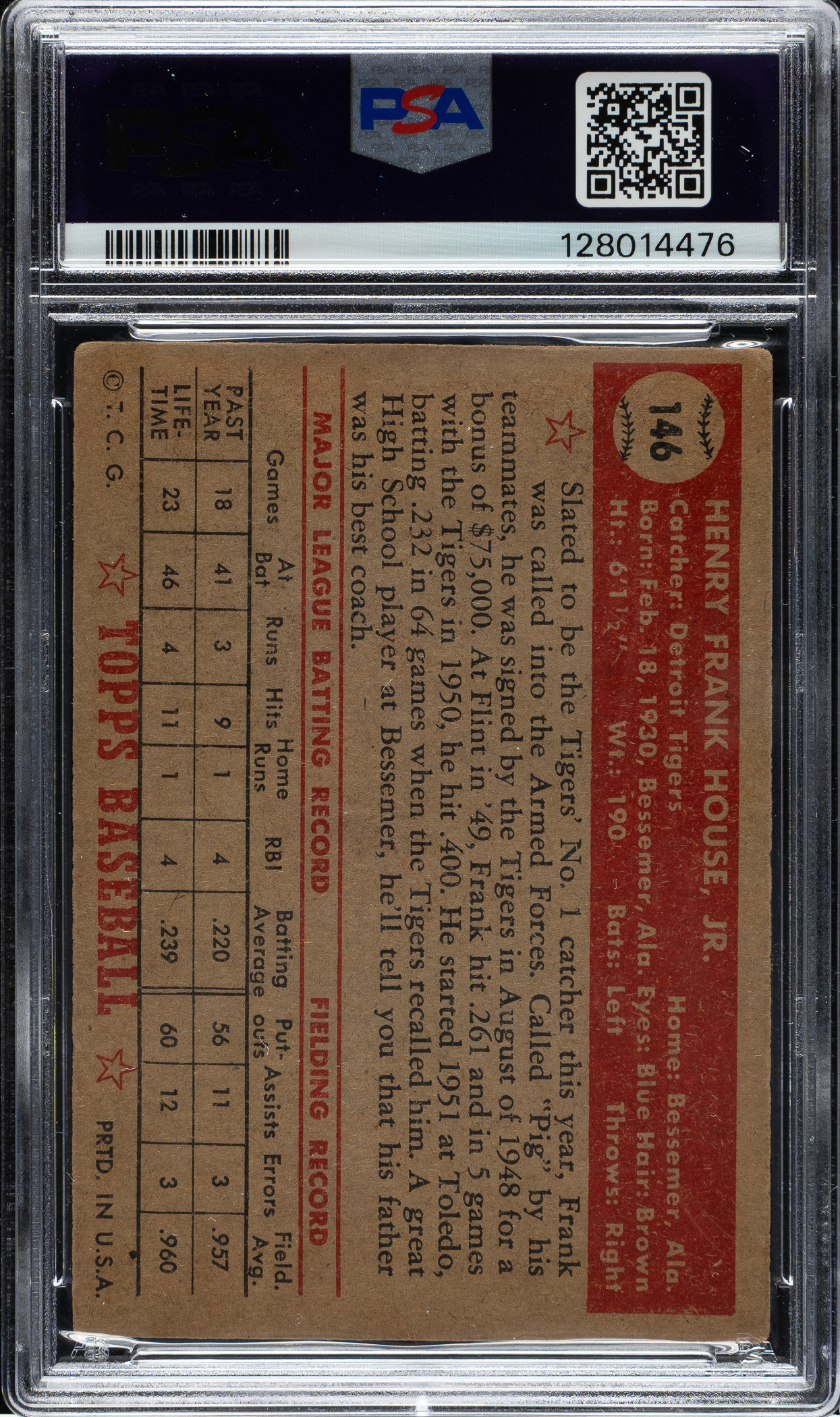 Graded VG 3 by PSA. Attractive example of #146 Frank House (Detroit Tigers) from the 1952 Topps "Canadian" gray-back series. Cards #131-190 within the 407-card 1952 Topps set are most commonly found printed on cream-colored stock. A small percentage of cards have been found printed on gray-colored stock. The Standard Catalog of Baseball Cards presents a theory that these cards have come to be known as Canadian issued because the same phenomenon exists with 1954 Topps and an abbreviated set printed on gray stock designed for issue solely in Canada that year. Some collectors feel that this is a misnomer, instead theorizing that Topps produced a run of cards in this manner for one of two reasons. One is as simple as a temporary shortage of regular cream-colored stock in the factory during production. The other focuses on the slight differences in the card fronts, which as the Standard Catalog notes are "subjectively darker or more muted than the 'U.S.A.' versions." Some collectors believe that these cards were designed as part of a distribution arrangement with Kleenex and Doeskin tissues in which cards were inserted with packages of tissues. While no concrete evidence of this relationship has been unearthed, it is known that the "Rails and Sails" nonsport issue produced by Topps in 1955 was issued along with Doeskin tissues at the time. The late Bob Lemke, former editor of the Standard Catalog, presents a detailed analysis of these variations on his blog (http://boblemke.blogspot.com/2011/05/1952-topps-not-canadian.html), which includes input from several longtime collectors and hobby researchers. Whatever the explanation for these cards, it is without dispute that they are extremely rare and even a single example can be hard to find! Bright, crisp, and clean, both front and back, with even corner wear, bold colors, and centering toward the right. An attractive example that will be of great interest to 1952 Topps master-set collectors as well as advanced Topps-card enthusiasts.