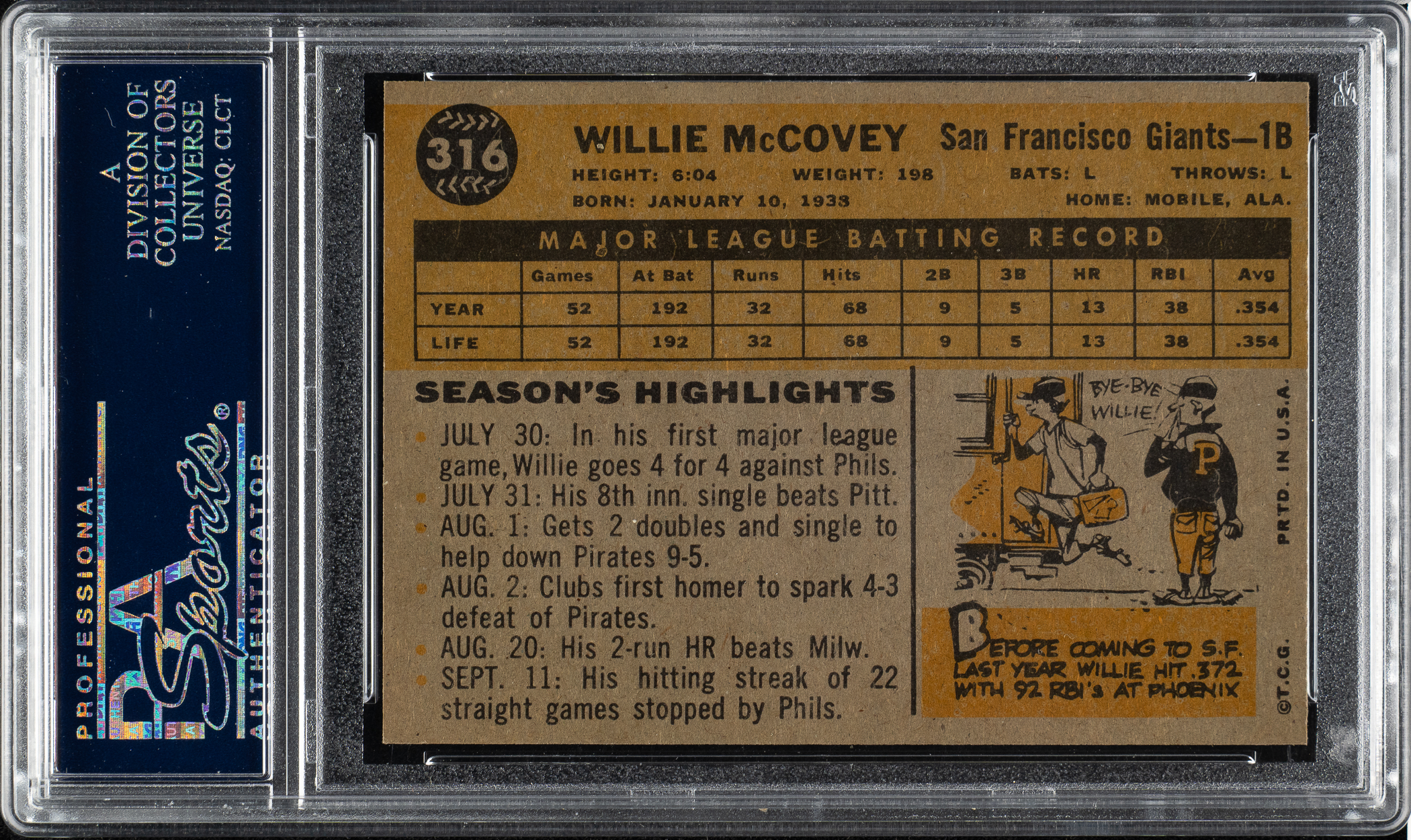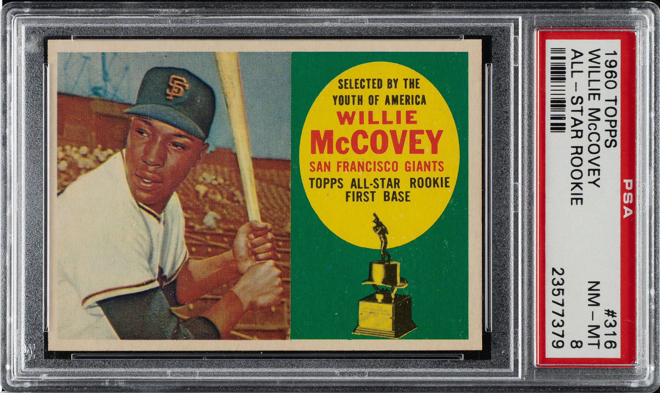 Graded NM-MT 8 by PSA. Outstanding high-grade example of San Francisco Giants Hall of Famer Willie McCovey's rookie card, one of the key cards to the 1960 Topps set. This example has bright colors, a well-focused image, and strong corners. Clean reverse.